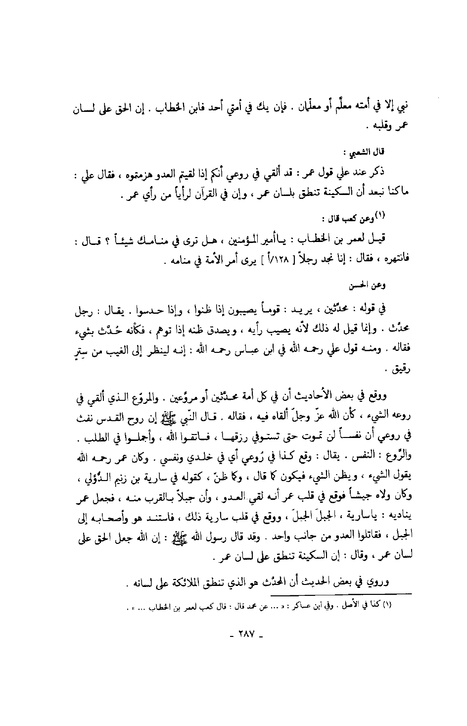 قال الشعبي: ذكر عند علي قول عمر: قد ألقي في روعي أنكم إذا لقيتم العدو هزمتموه، فقال علي: ما كنا نبعد أن السكينة تنطق بلسان عمر، وإن في القرآن لرأياً من رأي عمر.