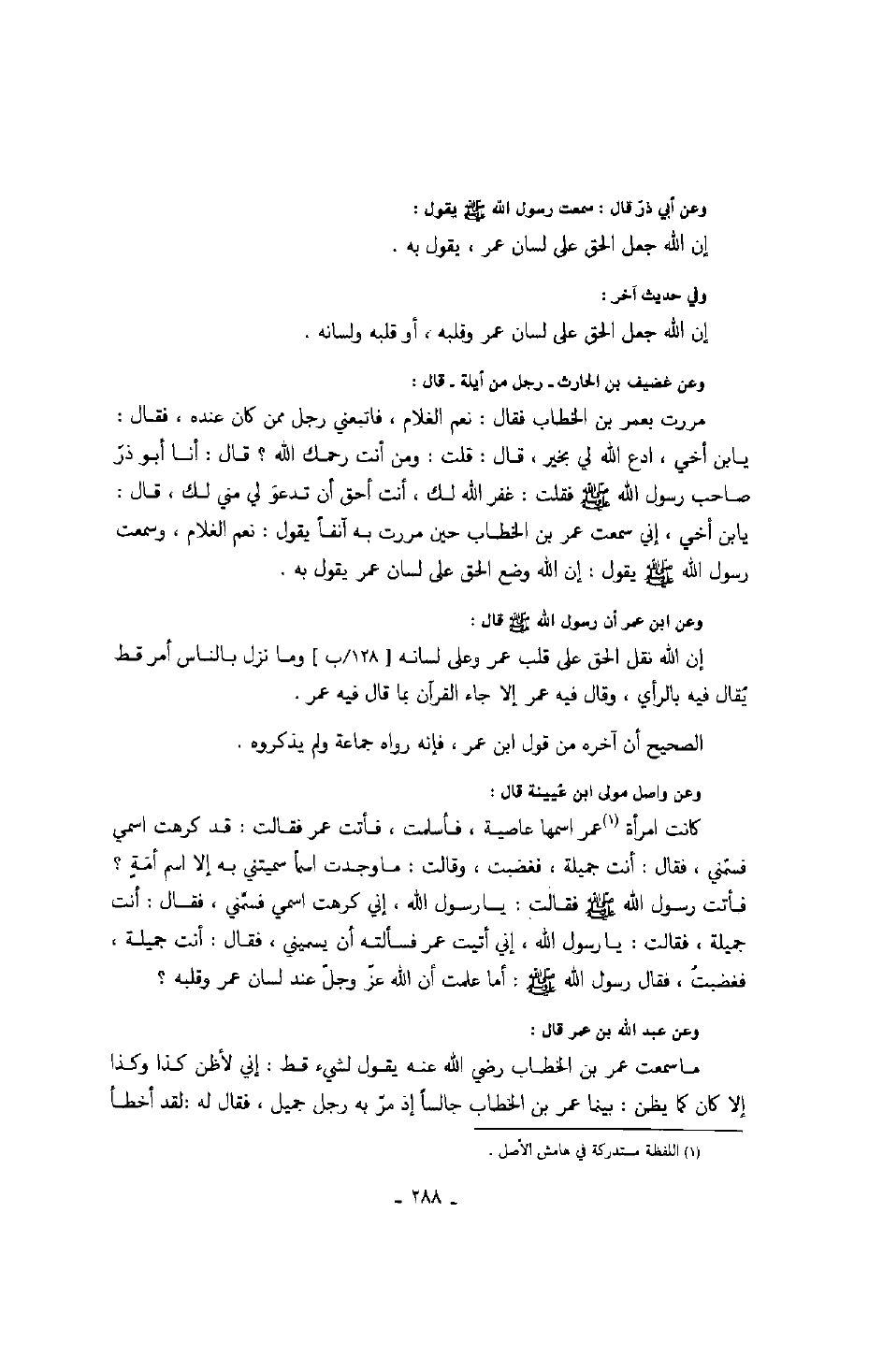 وفي حديث آخر: إن الله جعل الحق على لسان عمر وقلبه، أو قلبه ولسانه.