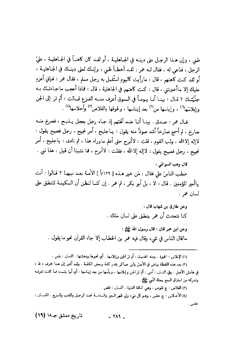 ظني، وإن هذا الرجل على دينه في الجاهلية، أول قد كان كاهناً في الجاهلية، عليّ الرجل، فدعي له، فقال له عمر: لقد أخطأ ظني، وإنك لعلى دينك في الجاهلية، أول قد كنت كاهنهم، قال: ما رأيت كاليوم استقبل به رجل مسلم، فقال عمر: فإني أعزم عليهم إلا ما أخبرتني، قال: كنت كاهنهم في الجاهلية، قال: فماذا أعجب ما جاءتك به جنّيّتك؟ قال: بينا أنا يوماً في السوق أعرف منه الفزع قالت: ألم تر إلى الجن وإبلاسها، وإياسها من بعد إيناسها، ولحوقها بالقلاس وأحلاسها.