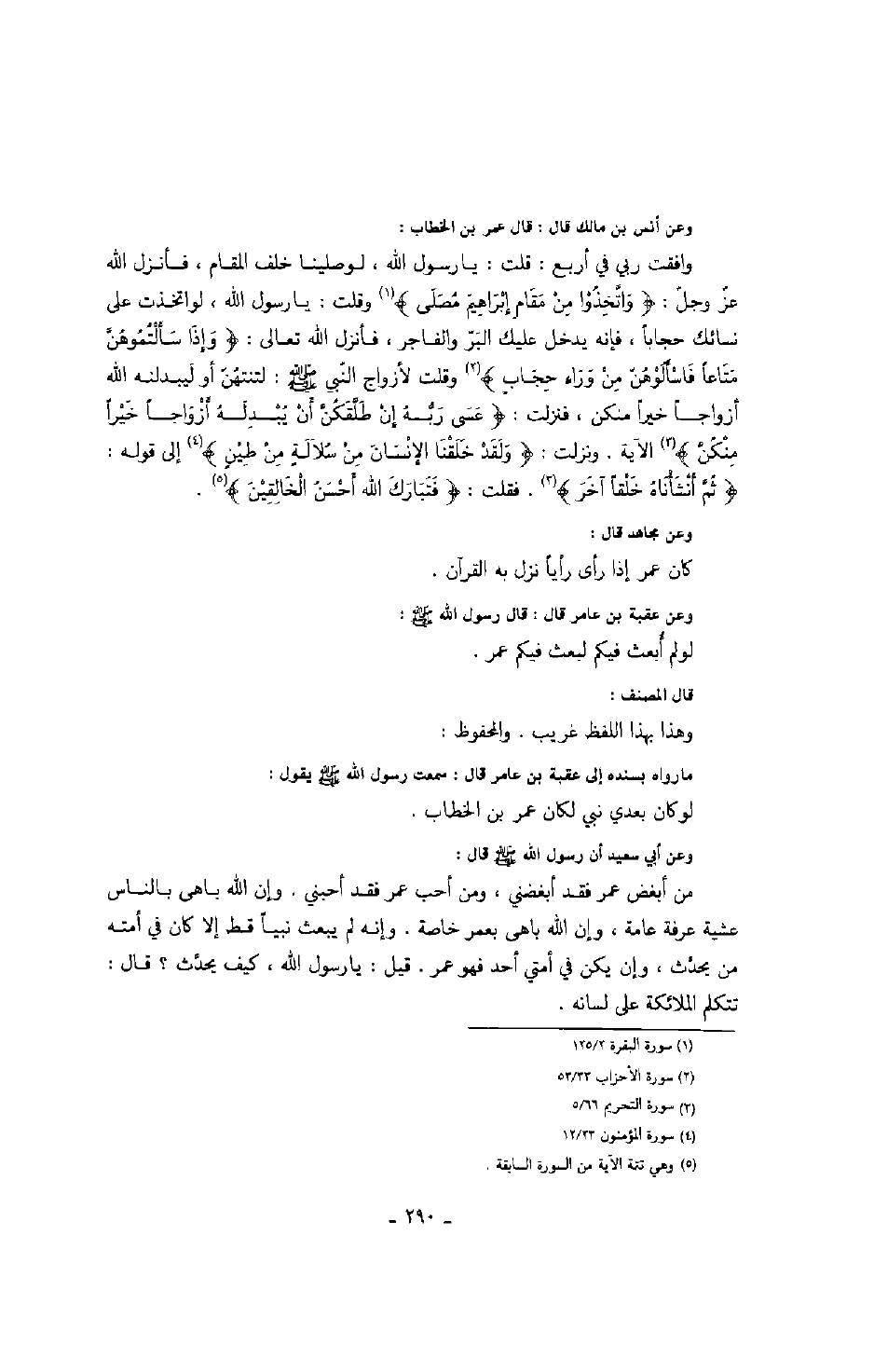 وعن أنس بن مالك قال: قال عمر بن الخطاب: وافقت ربي في أربع: قلت: يا رسول الله، لو صلينا خلف المقام، فأنزل الله عزّ وجلّ: " واتّخذوا من مقام إبراهيم مصلى " وقلت: يا رسول الله، لو اتخذت على نسائك حجاباً، فإنه يدخل عليك البرّ والفاجر، فأنزل الله تعالى: " وإذا سألتموهن متاعاً فاسألوهنّ من وراء حجابٍ " وقلت لأزواج النّبي صلّى الله عليه وسلّم: لتنتهنّ أو ليبدلنه الله أزواجاً خيراً منكن، فنزلت: " عسى ربّه إن طلّقكنّ أن يبدله أزواجاً خياراً منكنّ " الآية. ونزلت: " ولقد خلقنا الإنسان من سلالةٍ من طينٍ " إلى قوله: " ثمّ أنشأناه خلقاً آخر ". فقلت: " فتبارك الله أحسن الخالقين ".