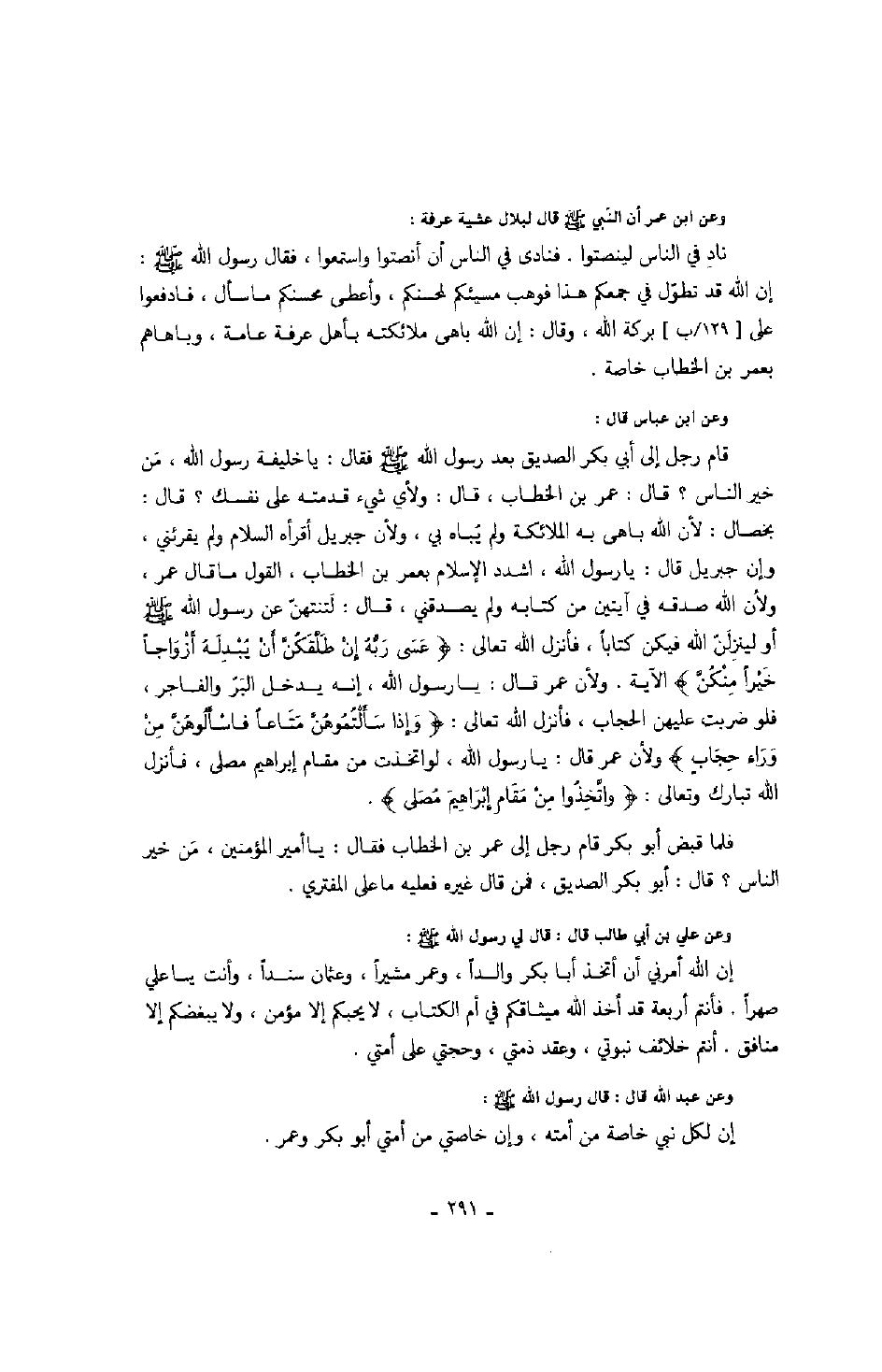 وعن علي بن أبي طالب قال: قال لي رسول الله صلّى الله عليه وسلّم: " إن الله أمرني أن أتخذ أبا بكر والداً، وعمر مشيراً، وعثمان سنداً، وأنت يا علي صهراً. فأنتم أربعة قد أخذ الله ميثاقكم في أم الكتاب، لا يحبكم إلا مؤمن، ولا يبغضكم إلا منافق. أنتم خلائف نبوتي، وعقد ذمتي، وحجتي على أمتي ".