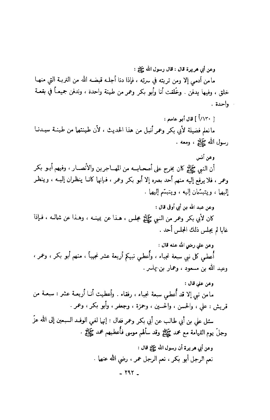 وعن أبي هريرة قال: قال رسول الله صلّى الله عليه وسلّم: " ما من آدمي إلا ومن تربته في سرته، فإذا دنا أجله قبضه الله من التربة التي منها خلق، وفيها يدفن. وخلقت أنا وأبو بكر وعمر من طينة واحدة، وندفن جميعاً في بقعة واحدة ".