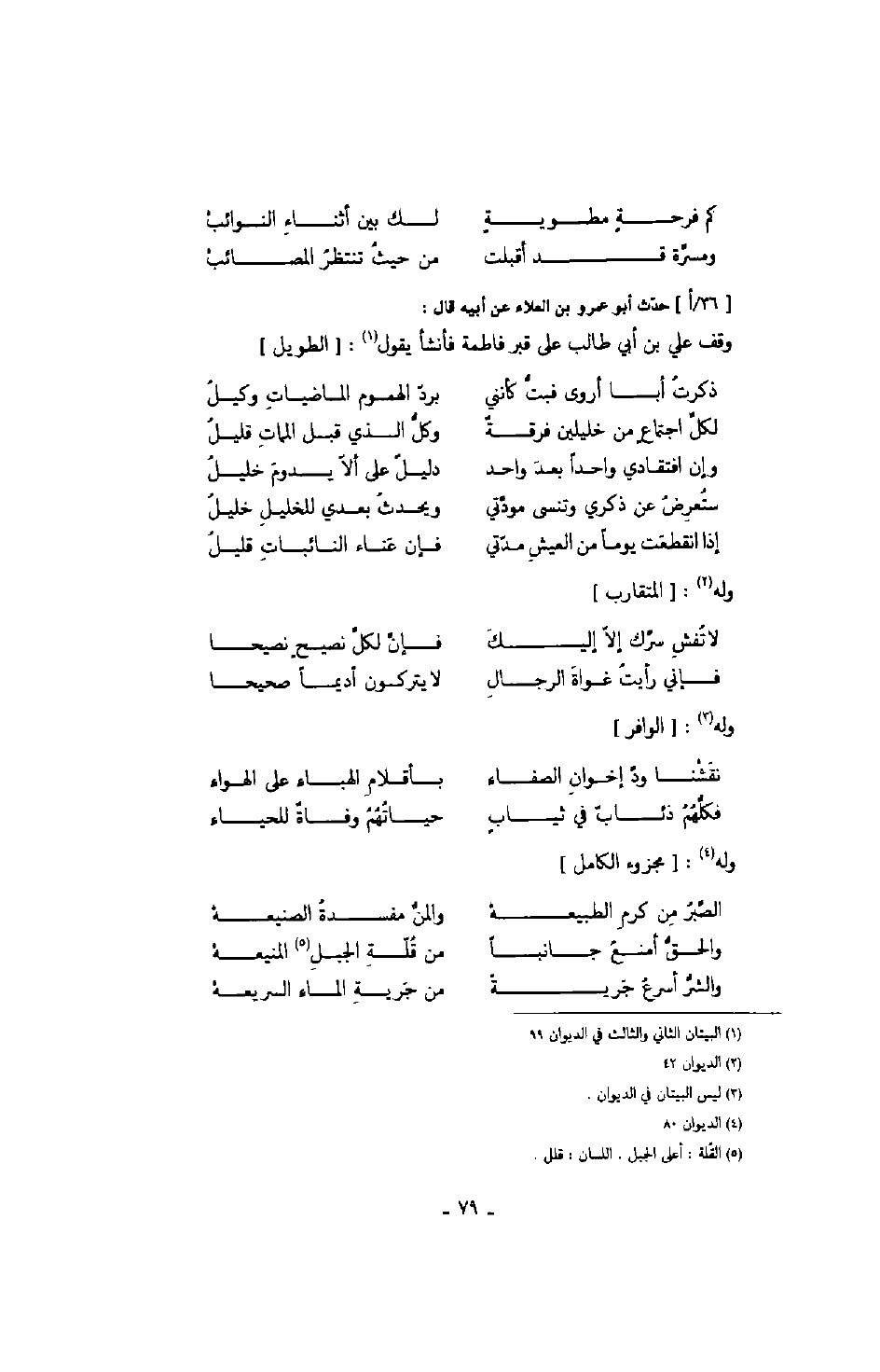 حدّث أبو عمرو بن العلاء عن أبيه قال: وقف علي بن أبي طالب على قبر فاطمة فأنشأ يقول: الطويل