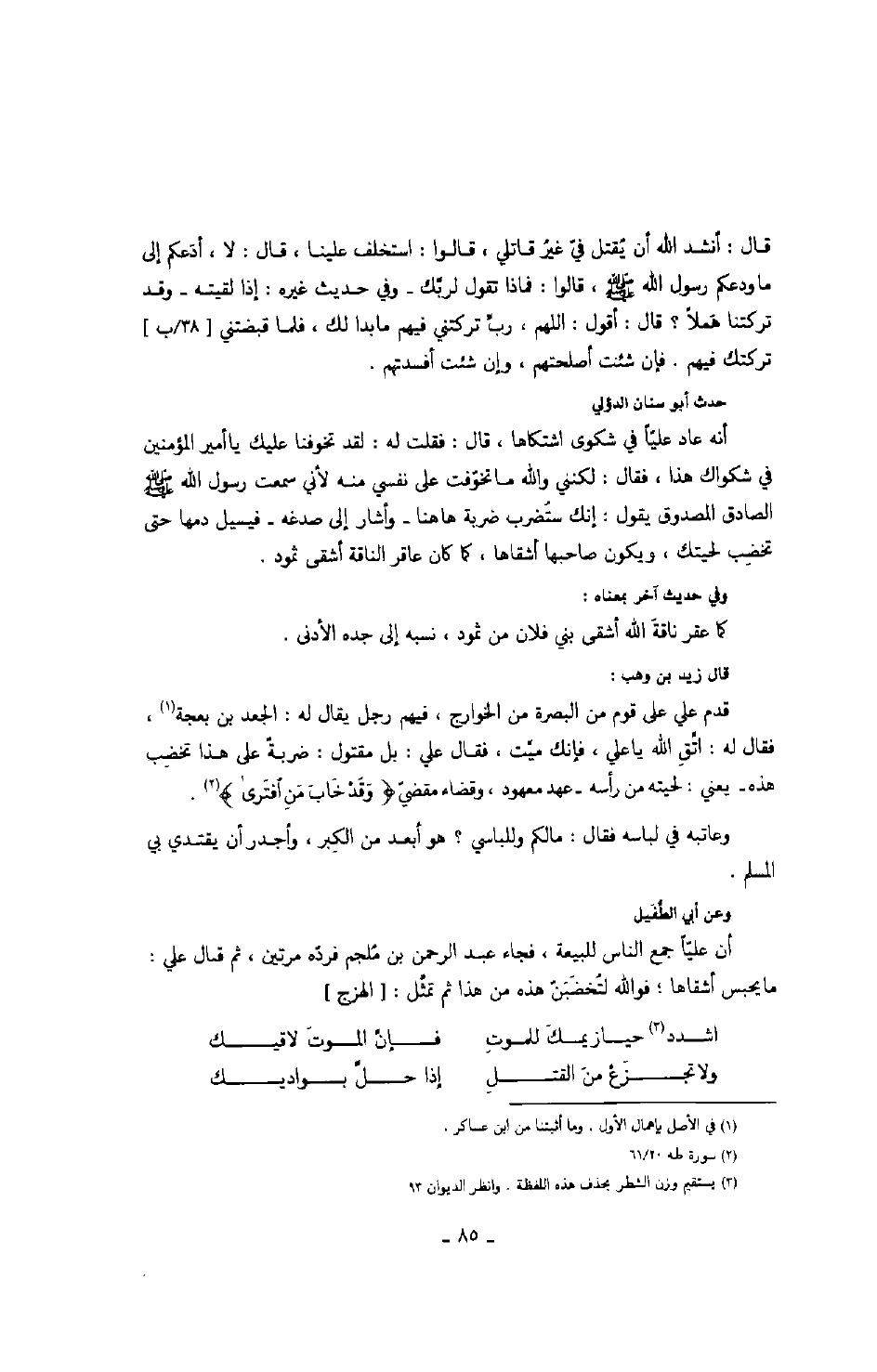 وعن أبي الطّفيل أن عليّاً جمع الناس للبيعة، فجاء عبد الرحمن بن ملجم فردّه مرتين، ثم قال علي: ما يحبس أشقاها؛ فواله لخضبنّ هذه من هذا ثم تمثّل: الهزج