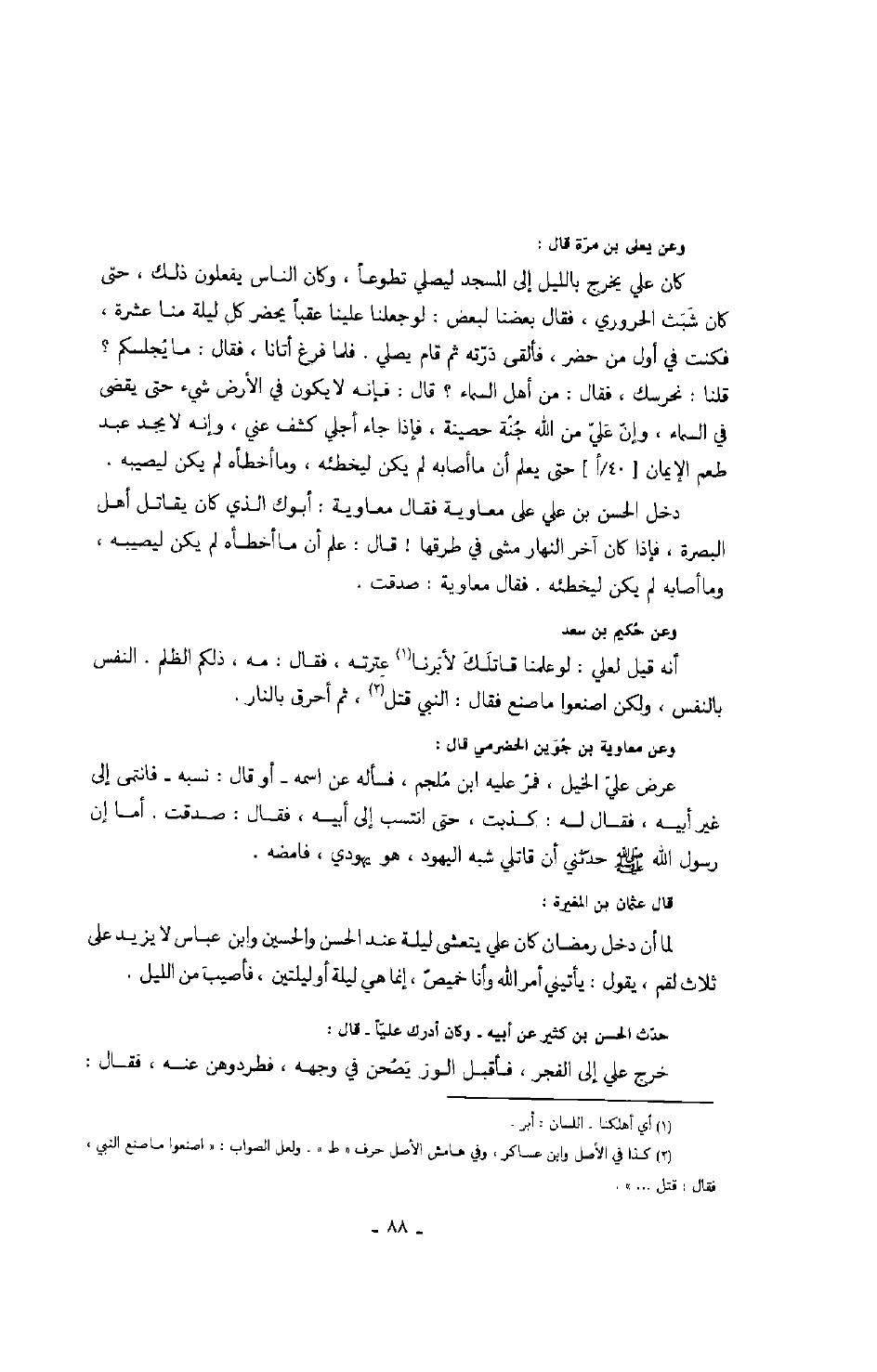 كان علي يخرج بالليل إلى المسجد ليصلي تطوعاً، وكان الناس يفعلون ذلك، حتى كان شبث الحروري، فقال بعضنا لبعض: لو جعلنا علينا عقباً يحضر كل ليلة منا عشرة، فكنت في أول من حضر، فألقى درّته ثم قام يصلي. فلما فرغ أتانا، فقال: ما يجلسكم؟ قلنا: نحرسك، فقال: من أهل السماء؟ قال: فإنه لا يكون في الأرض شيء حتى يقضى في السماء، وإنّ عليّ من الله جنّة حصينة، فإذا جاء أجلي كشف عني، وإنه لا يجد عبد طعم الإيمان حتى يعلم أن ما أصابه لم يكن ليخطئه، وما أخطأه لم يكن ليصيبه.
