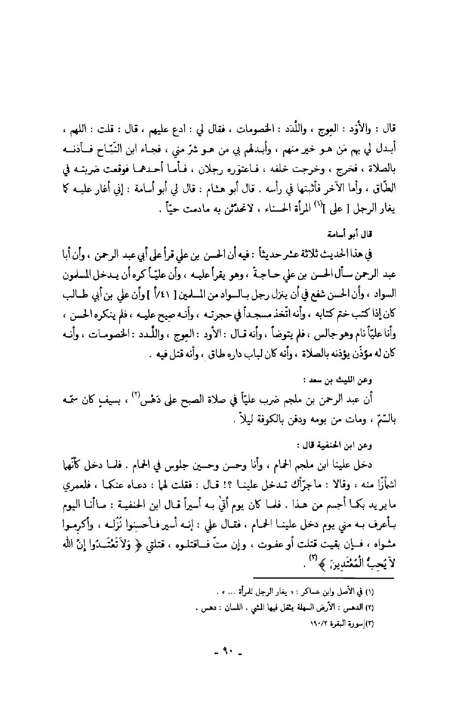 قال: والأود: العوج، واللّدد: الخصومات، فقال لي: " ادع عليهم "، قال: قلت: اللهم أبدل لي بهم من هو خير منهم، وأبدلهم بي من هو شرّ مني، فجاء ابن النّبّاح فآذنه بالصلاة، فخرج، وخرجت خلفه، فاعتوره رجلان، فأما أحدهما فوقعت ضربته في الطّاق، وأما الآخر فأثبتها في رأسه. قال أبو هشام: قال لي أبو أسامة: إني أغار عليه كما يغار الرجل على المرأة الحسناء، لا تحدّثن به ما دمت حيّاً.