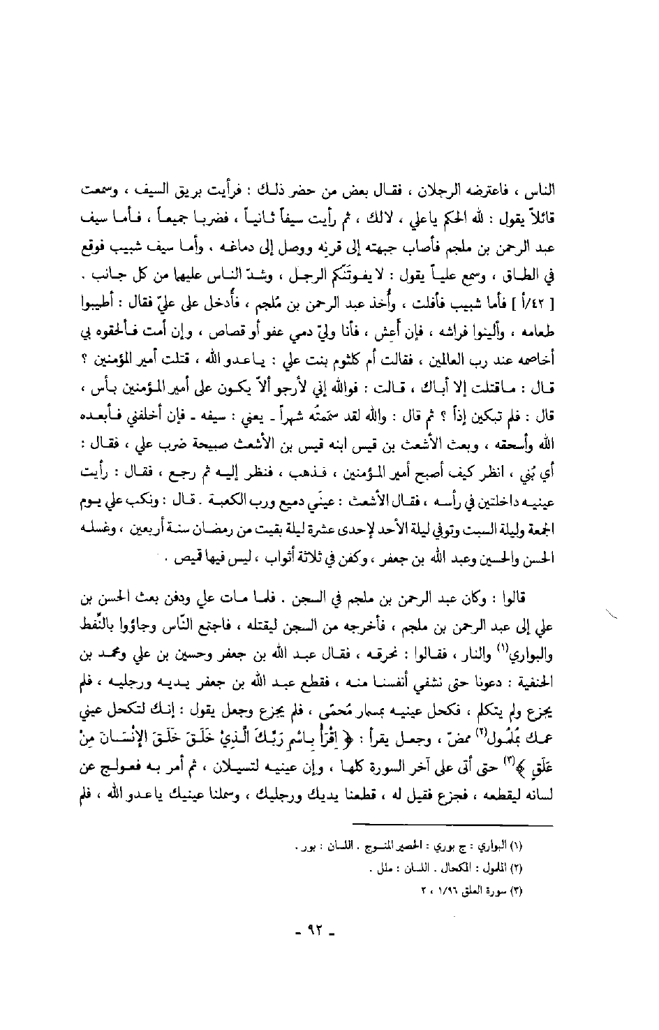 قالوا: وكان عبد الرحمن بن ملجم في السجن. فلما مات علي ودفن بعث الحسن بن علي إلى عبد الرحمن بن ملجم، فأخرجه من السجن ليقتله، فاجتمع النّاس وجاؤوا بالنّفط والبواري والنار، فقالوا: نحرقه، فقال عبد الله بن جعفر وحسين بن علي ومحمد بن الحنفية: دعونا حتى نشفي أنفسنا منه، فقطع عبد الله بن جعفر يديه ورجليه، فلم يجزع ولم يتكلم، فكحل عينيه بمسمار محمّى، فلم يجزع وجعل يقول: إنك لتكحل عيني عمك بملمول ممضّ، وجعل يقرأ: " اقرأ باسم ربّك الّذي خلق خلق الإنسان من علقٍ " حتى أتى على آخر السورة كلها، وإن عينيه لتسيلان، ثم أمر به فعولج عن لسانه ليقطعه، فجزع فقيل له، قطعنا يديك ورجليك، وسملنا عينيك يا عدو الله، فلم