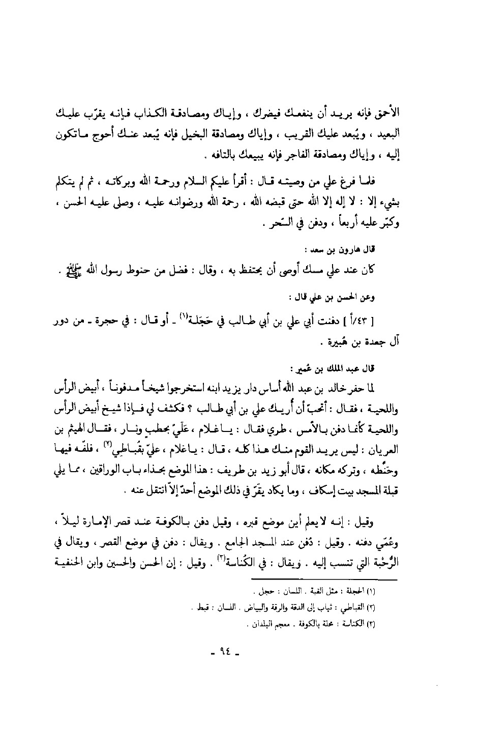 ون الحسن بن علي قال: دفنت أبي علي بن أبي طالب في حجرة أو قال: في حجرة من دور آل جعدة بن هبيرة.