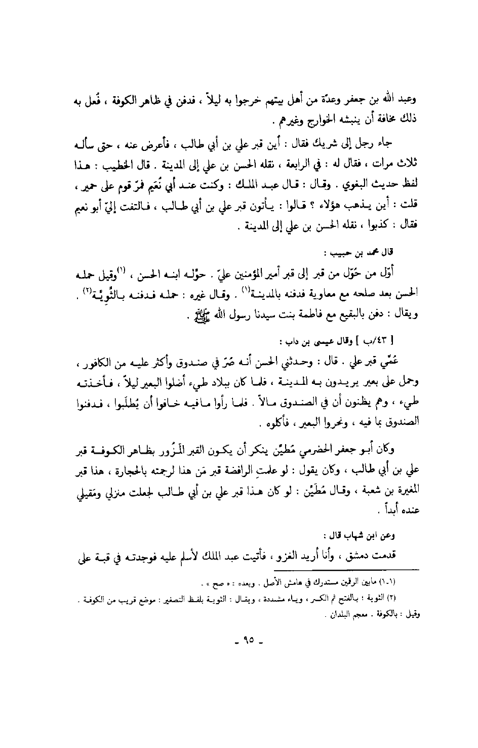 جاء رجل إلى شريك فقال: أين قبر علي بن أبي طالب، فأعرض عنه، حتى سأله ثلاث مرات، فقال له: في الرابعة، نقله الحسن بن علي إلى المدينة. قال الخطيب: هذا لفظ حديث البغوي. وقال: قال عبد الملك: وكنت عند أبي نعيم فمرّ قوم على حمير، قلت: أين يذهب هؤلاء؟ قالوا: يأتون قبر علي بن أبي طالب، فالتفت إليّ أبو نعيم فقال: كذبوا، نقله الحسن بن علي إلى المدينة.