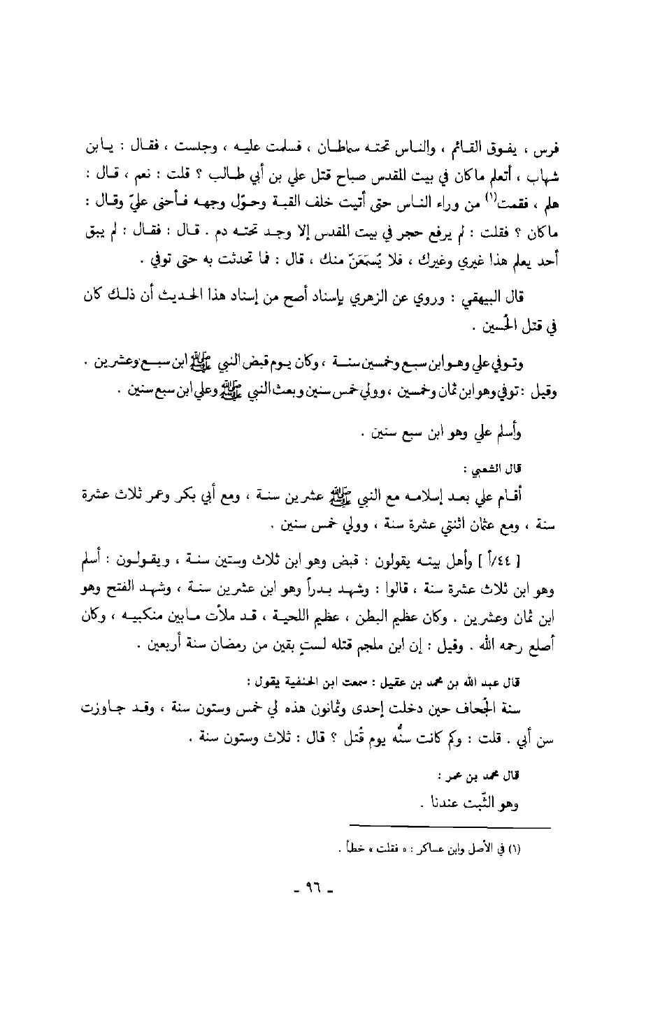 قال الشعبي: أقام علي بعد إسلامه مع النبي صلّى الله عليه وسلّم عشرين سنة، ومع أبي بكر وعمر ثلاث عشرة سنة، ومع عثمان اثنتي عشرة سنة، وولي خمس سنين.
