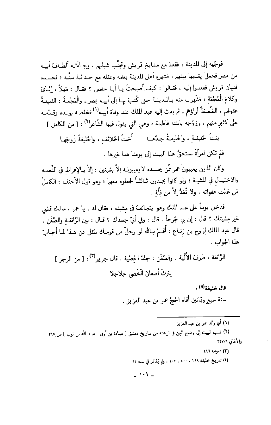 فلم تكن امرأة تستحق هذا البيت إلى يومنا هذا غيرها. وكان الذين يعيبون عمر ممّن يحسده إلا بشيئين: إلاّ بالإفراط في النّعمة والاختيال في المشية؛ ولو كانوا يجدون ثالثاً لجعلوه معهما؛ وهو الأحنف: الكامل من عدّت هفواته، ولا تعدّ إلاّ من قلّة. فدخل يوماً على عبد الملك وهو يتجانف في مشيته، فقال له: يا عمر، مالك تمشي غير مشيتك؟ قال: إن بي جرحاً. قال: وفي أيّ حسدك؟ قال: بين الرّانفة والصّفن. قال عبد الملك لروح بن زنباع: أقسم بالله لو رجل من قومك سئل عن هذا لما أجاب هذا الجواب. الرّانفة: طرف الألية. والصّفن: جلد الخصية. قال جرير: من الرجز يترك أصفان الخصى جلاجلا قال خليفة: سنة سبع وثمانين أقام الحجّ عمر بن عبد العزيز.