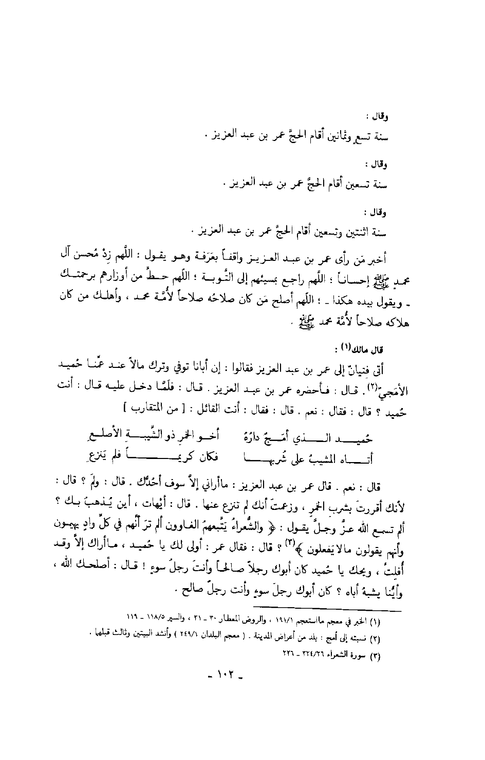 وقال: سنة اثنيتين وتسعين أقام الحجّ عمر بن عبد العزيز أخبر من رأى عمر بن عبد العزيز واقفاً بعرفة وهو يقول: اللهم زد محسن آل محمد صَلَّى اللهُ عَلَيْهِ وَسَلَّمَ إحساناً؛ اللهم راجع بمسيئهم إلى التّوبة؛ اللهم حطّ من أوزارهم برحمتك ويقول بيده هكذا؛ اللهم من كان صلاحه لأمّة محمد، وأهلك من كان هلاكه صلاحاً لأمّة محمد صَلَّى اللهُ عَلَيْهِ وَسَلَّمَ.