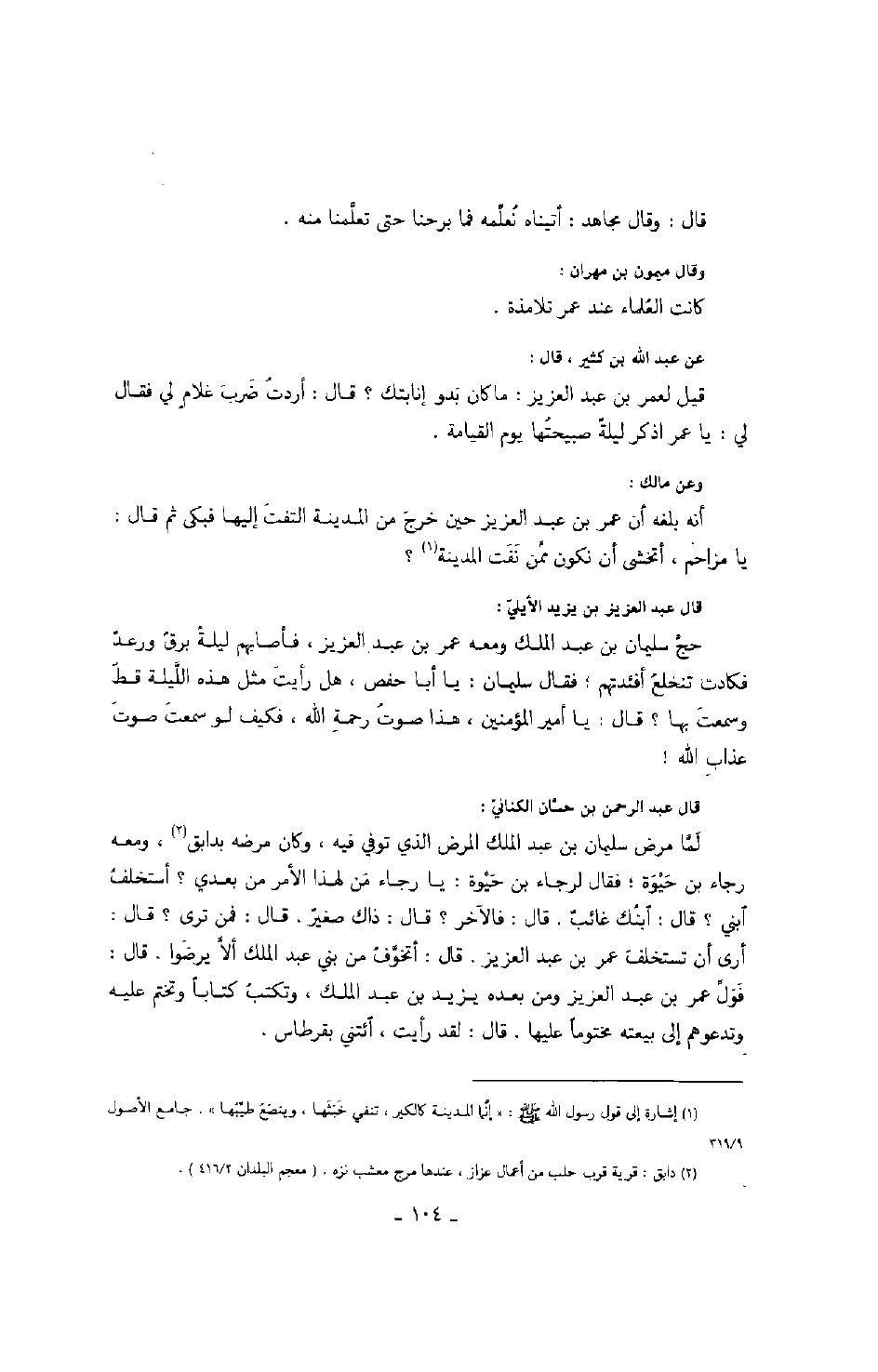 وعن مالك: أنه بلغه أن عمر بن عبد العزيز حين خرج من المدينة التفت إليها فبكى ثم قال: يا مزاحم، أتخشى أن نكون ممّن نفت المدينة؟ قال عبد العزيز بن يزيد الأيليّ: حجّ سليمان بن عبد الملك ومعه عمر بن عبد العزيز، فأصابهم ليلةً برقّ ورعد فكادت تنخلع أفئدتهم؛ فقال سليمان: يا أبا حفص، هل رأيت مثل هذه اللّيلة قطّ وسمعت بها؟ قال: يا أمير المؤمنين، هذا صوت رحمة الله، فكيف لو سمعت صوت عذاب الله!