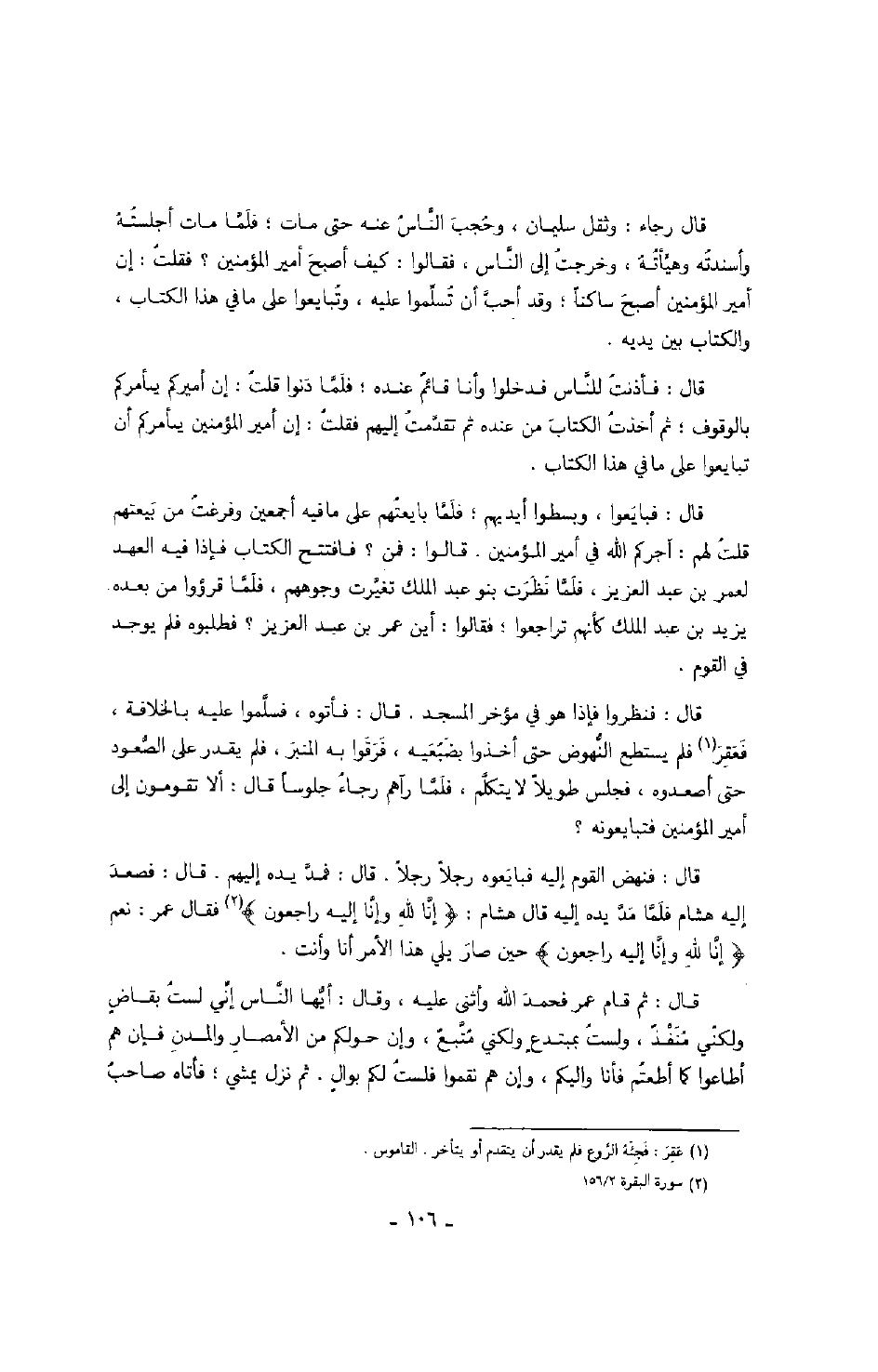 قال رجاء: وثقل سليمان، وحجب النّاس عنه حتى مات؛ فلمّا مات أجلسته وأسندته وهيّأته، وخرجت إلى النّاس، فقالوا: كيف أصبح أمير المؤمنين؟ فقلت: إن أمير المؤمنين أصبح ساكناً؛ وقد أحبّ أن تسلّموا عليه، وتبايعوا على ما في هذا الكتاب، والكتاب بين يديه. قال: فأذنت للنّاس فدخلوا وأنا قائم عنده؛ فلمّا دنوا قلت: إن أميركم يأمركم بالوقوف؛ ثم أخذت الكتاب من عنده ثم تقدّمت إليهم فقلت: إن أمير المؤمنين يأمركم أن تبايعوا على ما في هذا الكتاب. قال: فبايعوا، وبسطوا أيديهم؛ فلمّا بايعتهم على ما فيه أجمعين وفرغت من بيعتهم قلت لهم: آجركم الله في أمير المؤمنين. قالوا: فمن؟ فافتتح الكتاب فإذا فيه العهد لعمر بن عبد العزيز، فلمّا نظرت بنو عبد الملك تغيّرت وجوههم، فلمّا قرؤوا من بعده يزيد بن عبد الملك كأنهم تراجعوا؛ فقالوا: أين عمر بن عبد العزيز؟ فطلبوه فلم يوجد في القوم. قال: فنظروا فإذا هو في مؤخر المسجد. قال: فأتوه، فسلّموا عليه بالخلافة، فعقر فلم يستطع النّهوض حتى أخذوا بضبعيه، فرقوا به المنبر، فلم يقدر على الصّعود حتى أصعدوه، فجلس طويلاً لايتكلّم، فلمّا رآهم رجاء جلوساً قال: ألا تقومون إلى أمير المؤمنين فتبايعونه؟ قال: فنهض القوم إليه فبايعوه رجلاً رجلاً. قال: فمدّ يده إليهم. قال: فصعد إليه هشام فلمّا مدّ يده إليه قال هشام: " إنّا لله وإنّا إليه راجعون " فقال عمر: نعم " إنّا لله وإنّا إليه راجعون " حين صار يلي هذا الأمر أنا وأنت. قال: ثم قام عمر فحمد الله وأثنى عليه، وقال: أيّها النّاس إنّي لست بقاض ولكنّي منفّذ، ولست بمبتدع ولكنّي متّبع، وإن حولكم من الأمصار والمدن فإن هم أطاعوا كما أطعتم فأنا واليكم، وإن هم نقموا فلست لكم بوال. ثم نزل يمشي؛ فأتاه صاحب