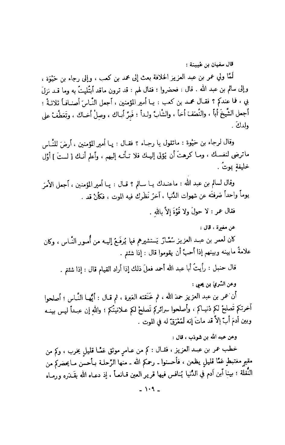 عن مغيرة، قال: كان لعمر بن عبد العزيز سمار يستشيرهم فيما يرفع إليه كم أمور النّاس، وكان علامة ما بينه وبينهم إذا أحبّ أن يقوموا قال: إذا شئتم. قال حنبل: رأيت أبا عبد الله أحمد فعل ذلك إذا أراد القيام قال: إذا شئتم.