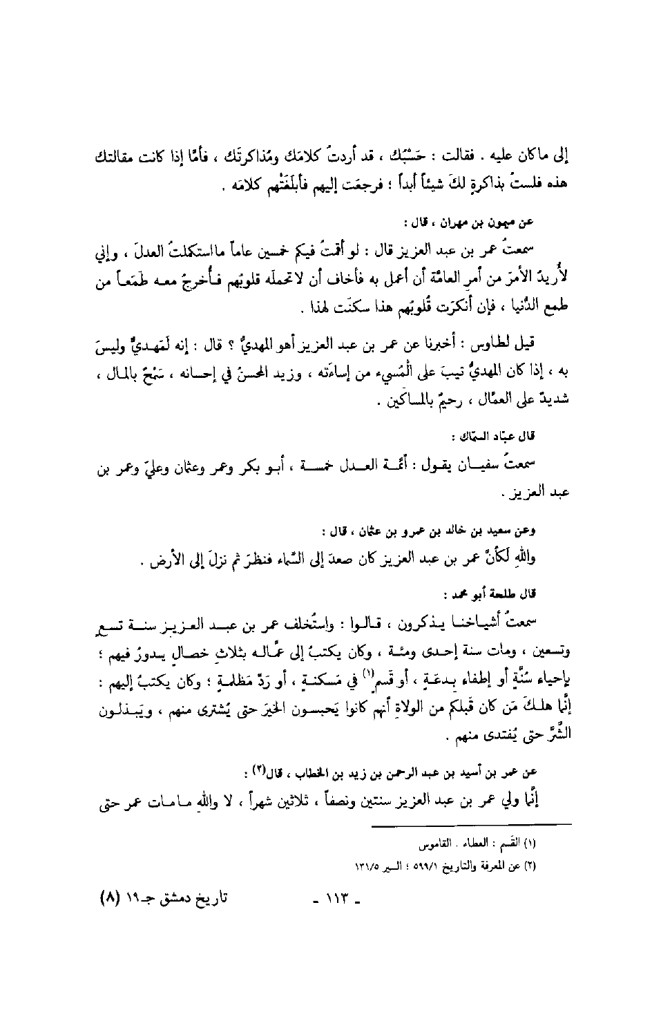 عن عمر بن أسيد بن عبد الرّحمن بن زيد بن الخطّاب، قال: إنّما ولي عمر بن عبد العزيز سنتين ونصفاً، ثلاثين شهراً، لا والله ما مات عمر حتى