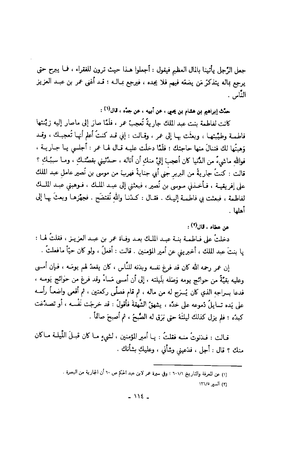 عن عطاء، قال: دخلت على فاطمة بنت عبد الملك بعد وفاة عمر بن عبد العزيز، فقلت لها: يا بنت عبد الملك، أخبريني عن أمير المؤمنين. قالت: أفعل، ولو كان حيّاً ما فعلت.