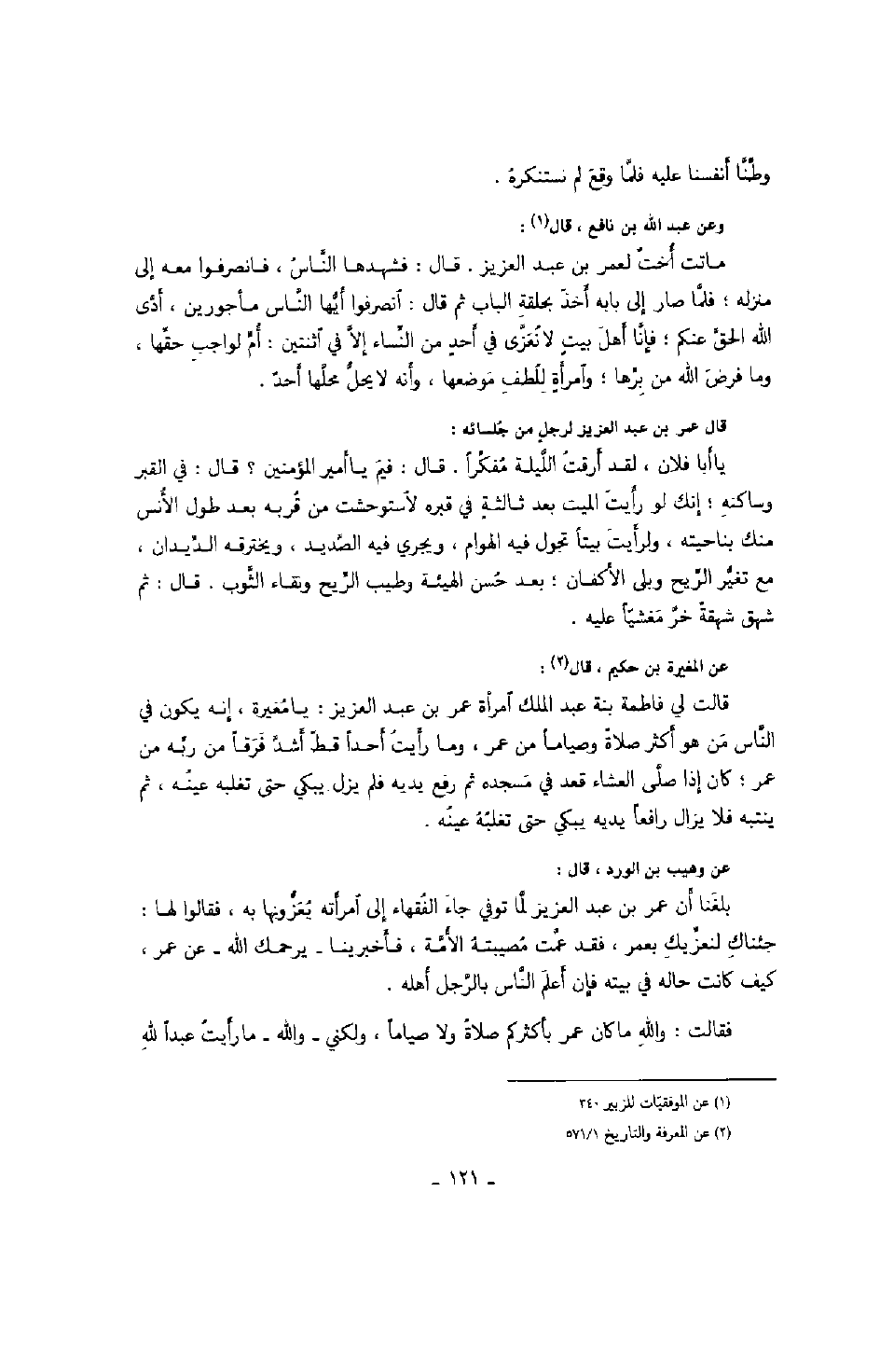 وعن عبد الله بن نافع، قال: ماتت أخت لعمر بن عبد العزيز. قال: فشهدها النّاس، فانصرفوا معه إلى منزله؛ فلّما صار إلى بابه أخذ بحلقة الباب ثم قال: انصرفوا أيّها النّاس مأجورين، أدّى الله الحقّ عنكم؛ فإنا أهل بيت لا نعزّى في أحد من النّساء إلاّ في اثنتين: أمّ لواجب حقّها، وما فرض الله من برّها؛ وامرأة للطف موضعها، وأنه لا يحلّ محلّها أحد.
