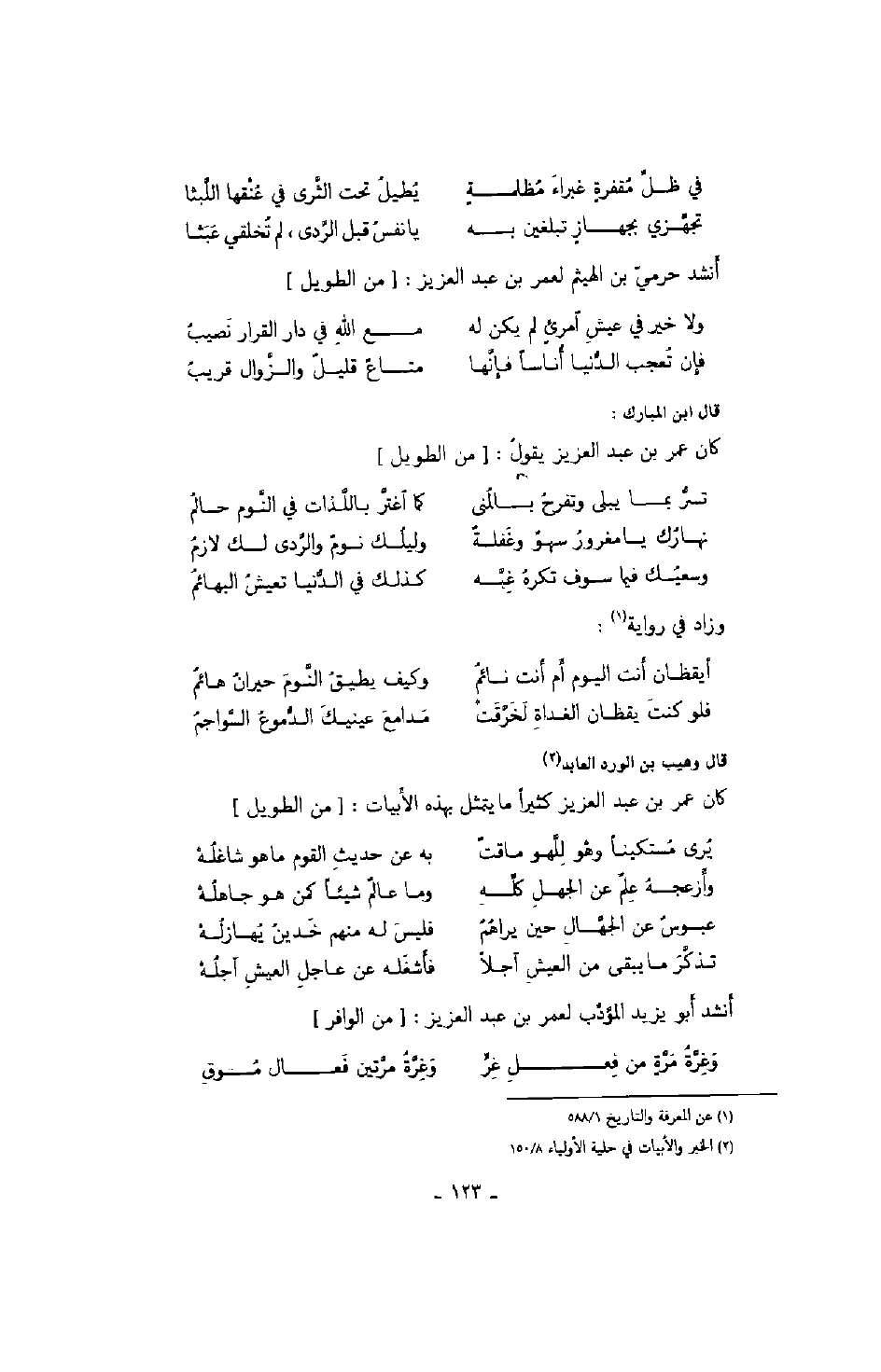 قال وهيب بن الورد العابد: كان عمر بن عبد العزيز كثيراً ما يتمثل بهذه الأبيات: من الطويل