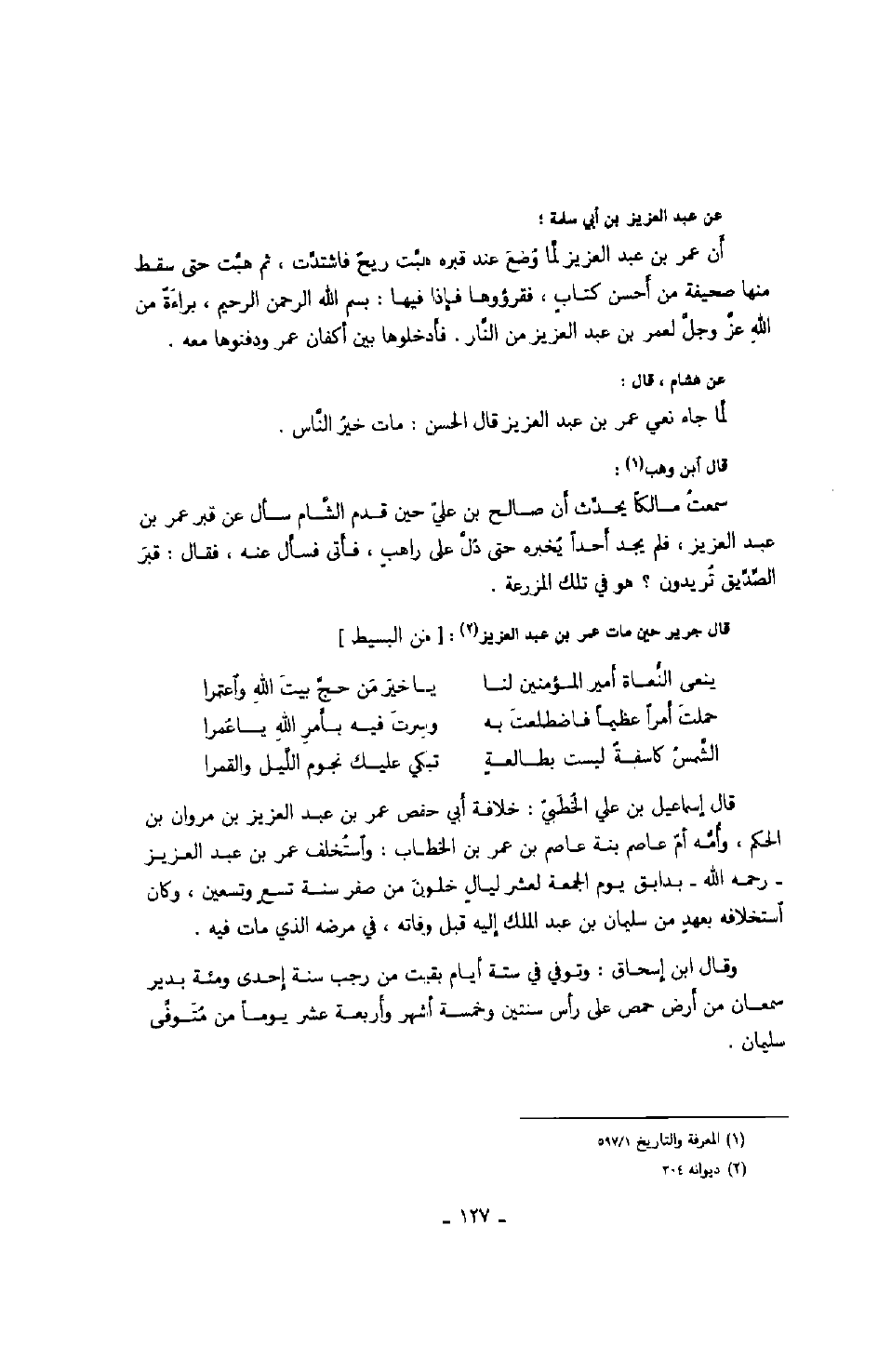 قال إسماعيل بن علي الخطبيّ: خلافة أبي حفص عمر بن عبد العزيز بن مروان بن الحكم، وأمّه أمّ عاصم بنة عاصم بن عمر بن الخطاب: واستخلف عمر بن عبد العزيز رحمه الله بدابق يوم الجمعة لعشر ليل خلون من صفر سنة تسع وتسعين، وكان استخلافه بعهد من سليمان بن عبد الملك إليه قبل وفاته، في مرضه الذي مات فيه. وقال ابن إسحاق: وتوفي في ستة أيام بقيت من رجب سنة إحدى ومئة بدير سمعان من أرض حمص على رأس سنتين وخمسة أشهر وأربعة عشر يوماً من متوفّى سليمان.
