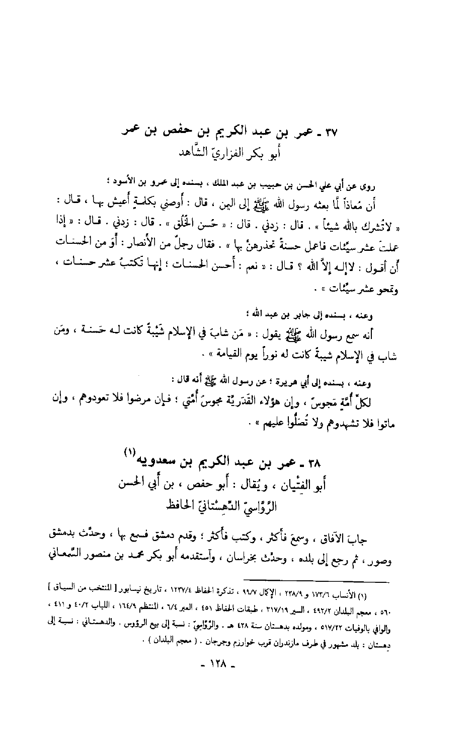 ابن عمر أبو بكر الفزاريّ الشّاهد روى عن أبي علي الحسن بن حبيب بن عبد الملك، بسنده إلى عمرو بن الأسود: أن معاذاً لمّا بعثه رسول الله صَلَّى اللهُ عَلَيْهِ وَسَلَّمَ إلى اليمن، قال: أوصني بكلمة أعيش بها، قال: لا تشرك بالله شيئاً. قال: زدني. قال: حسن الخلق. قال: زدني. قال: " إذا عملت عشر سيئات فاعمل حسنةً تحذرهنّ بها ". فقال: رجل من الأنصار: أو من الحسنات أن أقول: لا إله إلاّ الله؟ قال: نعم: أحسن الحسنات؛ إنها تكتب عشر حسنات، وتمحو عشر سيّئات.