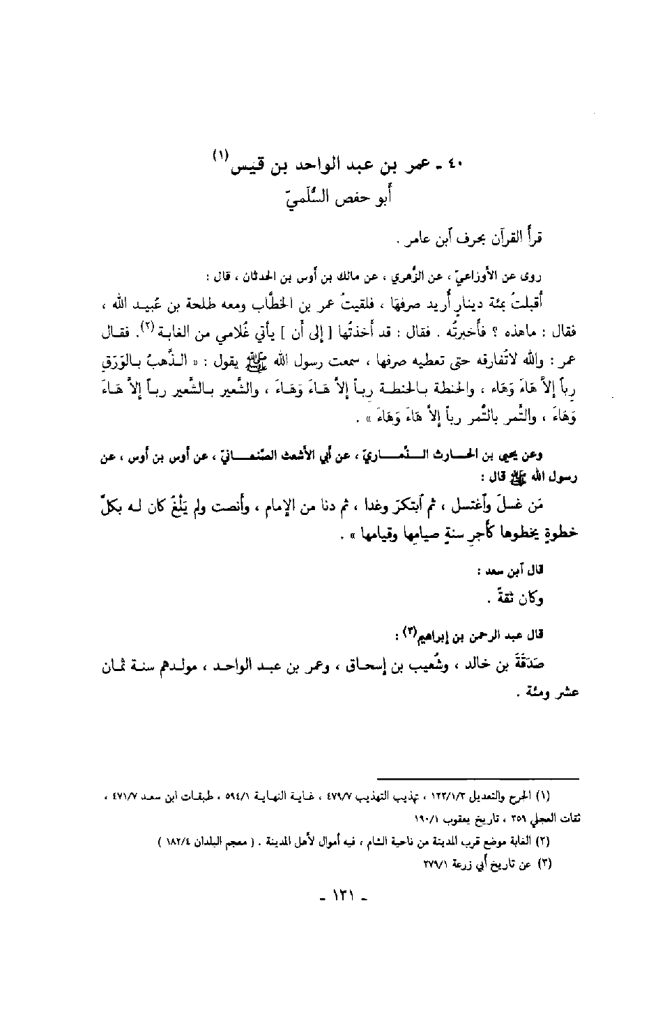 روى عن الأوزاعيّ، عن الزّهري، عن مالك بن أوس بن الحدثان، قال: أقبلت بمئة دينار أريد صرفها، فلقيت عمر بن الخطّاب ومعه طلحة بن عبيد الله، فقال: ما هذه؟ فأخبرته. فقال: قد أخذتها إلى أن يأتي غلامي من الغابة. فقال عمر: والله لا تفارقه حتى تعطيه صرفها، سمعت رسول الله صَلَّى اللهُ عَلَيْهِ وَسَلَّمَ يقول: " الذّهب بالورق رباً إلاّ هاء وهاء، والحنطة بالحنطة رباً إلاّ هاء وهاء، والشّعير بالشّعير رباً إلاّ هاء وهاء، والتّمر بالتّمر رباً إلاّ هاء وهاء ".