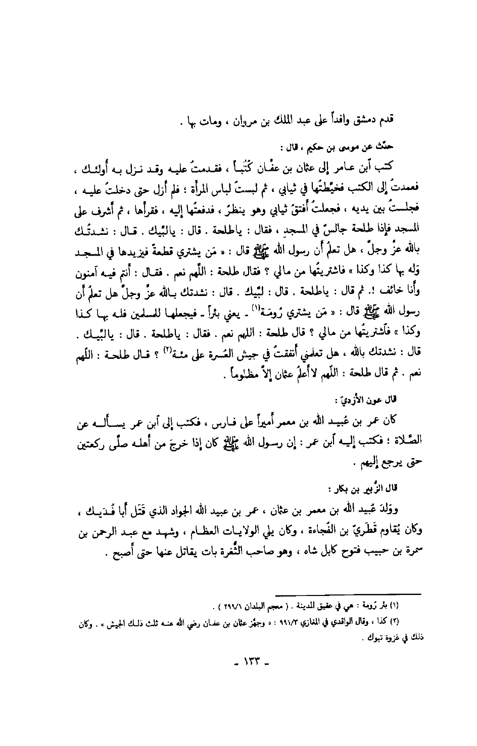 حدّث عن موسى بن حكيم، قال: كتب ابن عامر إلى عثمان بن عفّان كتباً، فقدمت عليه وقد نزل به أولئك، فعمدت إلى الكتب فخيّطتها في ثيابي، ثم لبست لباس المرأة؛ فلم أزل حتى دخلت عليه، فجلست بين يديه، فجعلت أفتق ثيابي وهو ينظر، فدفعتها إليه، فقرأها، ثم أشرف على المسجد فإذا طلحة جالس في المسجد، فقال: يا طلحة. قال: يا لبيّك. قال: نشدتك بالله عزّ وجلّ، هل تعلم أن رسول الله صَلَّى اللهُ عَلَيْهِ وَسَلَّمَ قال: " من يشتري قطعة فيزيدها في المسجد وله بها كذا وكذا " فاشتريتها من مالي؟ فقال طلحة: اللهم نعم. فقال: أنتم فيه آمنون وأنا خائف!. ثم قال: يا طلحة. قال: لبيّك. قال: نشدتك بالله عزّ وجلّ هل تعلم أن رسول الله صَلَّى اللهُ عَلَيْهِ وَسَلَّمَ قال: " من يشتري رومة يعني بئراً فيجعلها للمسلمين فله بها كذا وكذا " فاشتريتها من مالي؟ قال طلحة: اللهم نعم. فقال: يا طلحة. قال لبّيك. قال نشدتك بالله، هل تعلمني أنفقت في جيش العسرة على مئة؟ قال طلحة: اللهم نعم. ثم قال طلحة: اللهم لا أعلم عثمان إلاّ مظلوماً.