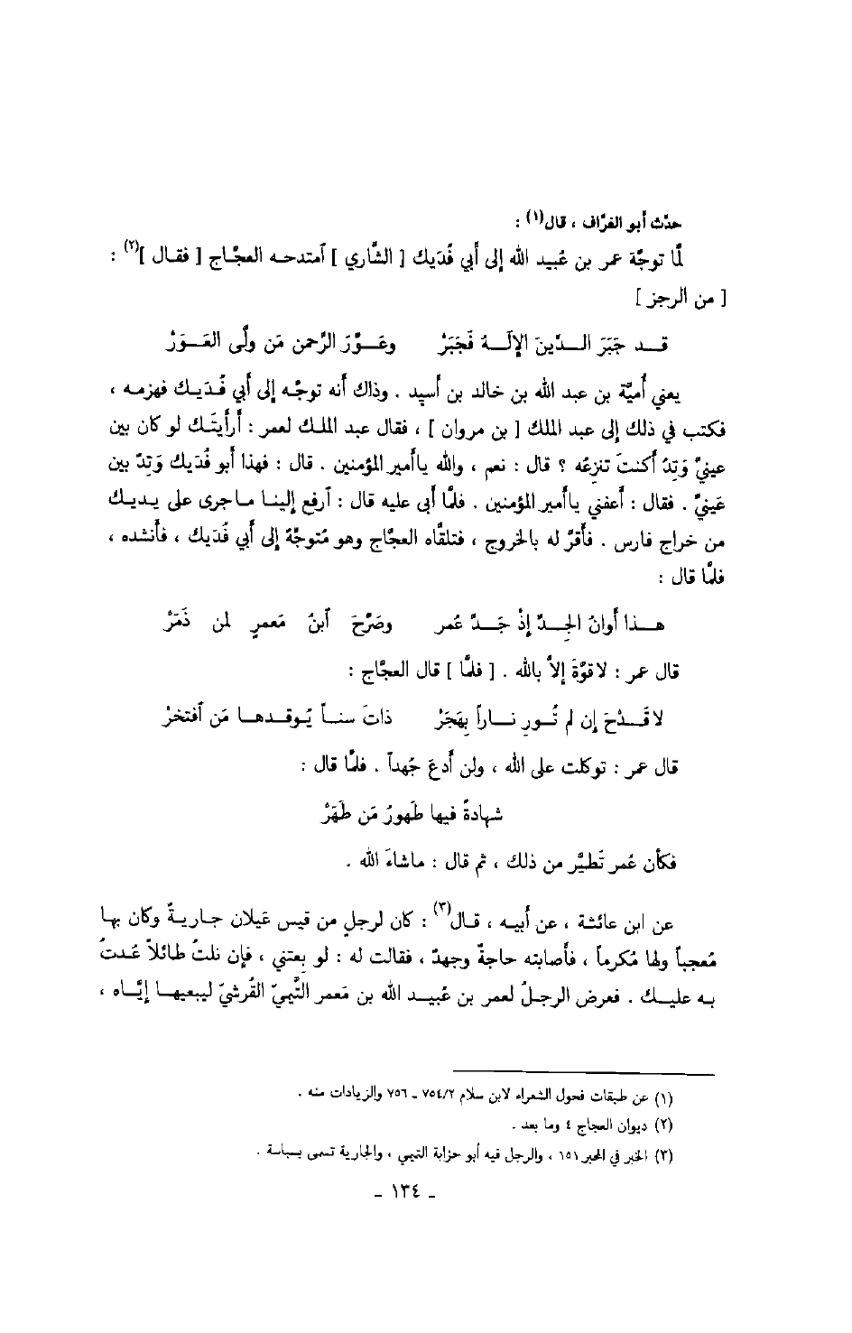 حدّث أبو الغرّاف، قال: لّما توجّه عمر بن عبيد الله إلى أبي فديك الشّاري امتدحه العجّاج فقال من الرجز