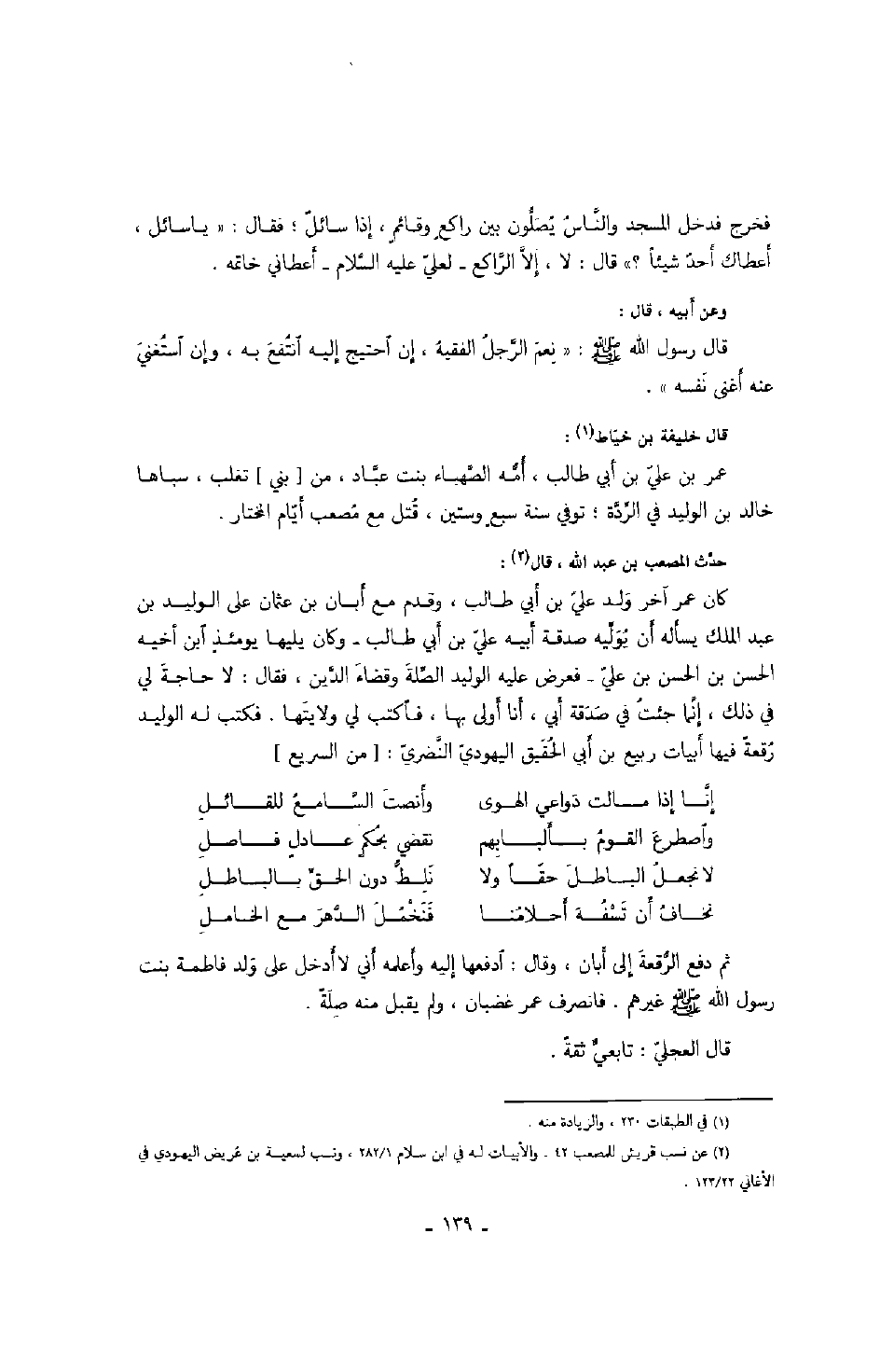 حدّث المصعب بن عبد الله، قال: كان عمر آخر عليّ بن أبي طالب، وقدم مع أبان بن عثمان على الوليد بن عبد الملك يسأله أن يولّيه صدقة أبيه عليّ بن أبي طالب وكان يليها يومئذ ابن أخيه الحسن بن الحسن بن عليّ فعرض عليه الوليد الصّلة وقضاء الدّين، فقال: لا حاجة لي في ذلك، إنّما جئت في صدقة أبي، أنا أولى بها، فاكتب لي ولايتها. فكتب له الوليد وقعةً فيها أبيات ربيع بن أبي الحقيق اليهوديّ النّضريّ: من السريع