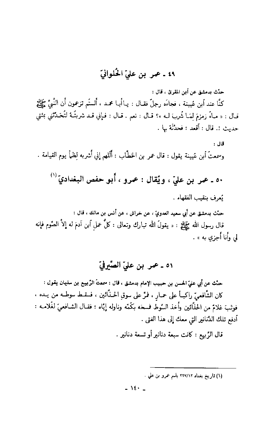 أبو حفص البغداديّ يعرف بنقيب الفقهاء. حدّث بدمشق عن أبي سعيد العدويّ، عن خراش، عن أنس بن مالك، قال: قال رسول الله صَلَّى اللهُ عَلَيْهِ وَسَلَّمَ: " يقول الله تبارك وتعالى: كلّ عمل ابن آدم له إلاّ الصّوم فإنه لي وأنا أجزي به.