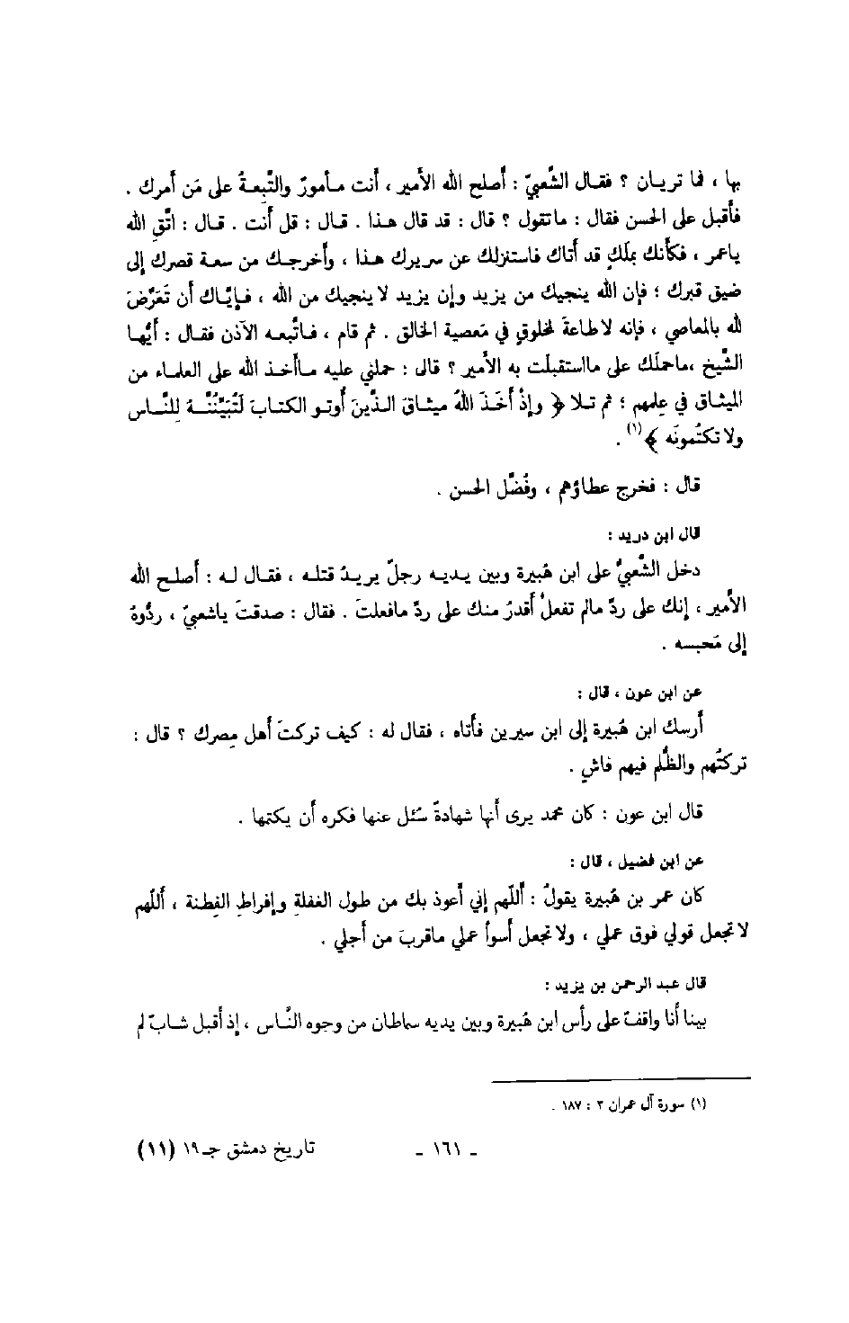 بها، فما تريان؟ فقال الشّعبيّ: أصلح الله الأمير، أنت مأمور والتّبعة على من أمرك. فأقبل على الحسن فقال: ما تقول؟ قال: قد قال هذا. قال: قل أنت. قال: اتّق الله يا عمر، فكأنك بملك قد أتاك فاستنزلك عن سريرك هذا، وأخرجك من سعة قصرك إلى ضيق قبرك؛ فإن الله ينجيك من يزيد وإن يزيد لا ينجيك من الله، فإيّاك أن تعرّض لله بالمعاصي، فإنه لا طاعة لمخلوق في معصيةً الخالق. ثم قام، فاتّبعه الآذن فقال: أيّها الشّيخ، ما حملك على ما استقبلت به الأمير؟ قال: حملني عليه ما أخذ الله على العلماء من الميثاق في علمهم؛ ثم تلا " وإذ أخذ الله ميثاق الذّين أوتو الكتاب لتبيّننّه للنّاس ولا تكتمونه ". قال: فخرج عطاؤهم، وفضّل الحسن.