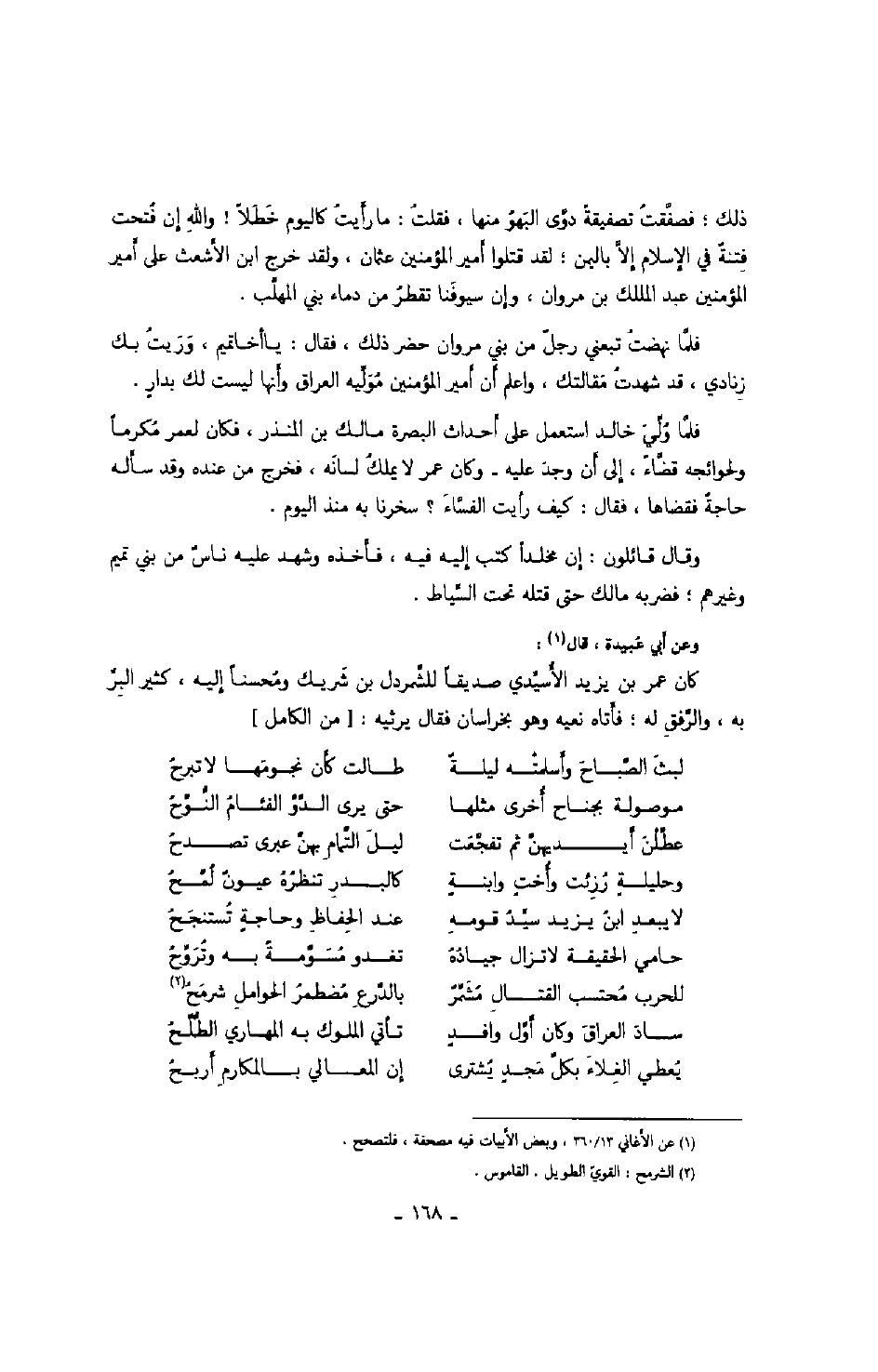 وعن عبيدة، قال: كان عمر بن يزيد الأسيّدي صديقاً للشّمردل بن شريك ومحسناً إليه، كثير البرّ به، والّرفق له؛ فأتاه نعية وهو بخراسان فقال يرثيه: من الكامل