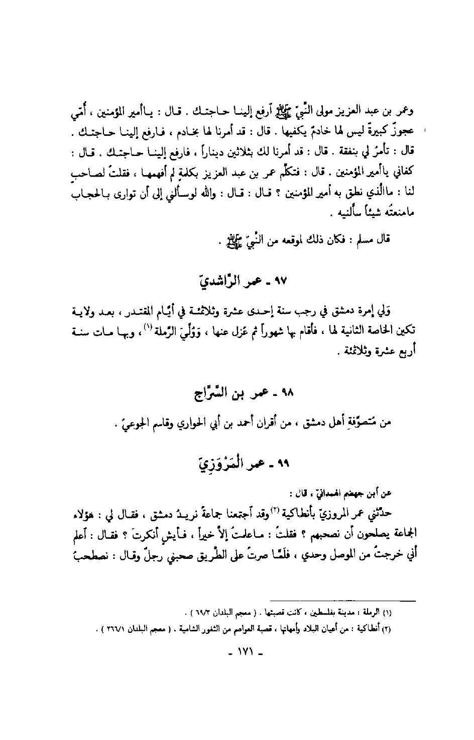 عن ابن جهضم الهمذانيّ، قال: حدّثني عمر المروزيّ بأنطاكية وقد اجتمعنا جماعةً نريد دمشق، فقال لي: هؤلاء الجماعة يصلحون أن نصحبهم؟ فقلت: ما علمت إلاّ خيراً، فأيش أنكرت؟ فقال: اعلم أني خرجت من الموصل وحدي، فلمّا صرت على الطّريق صحبني رجل وقال: نصطحب