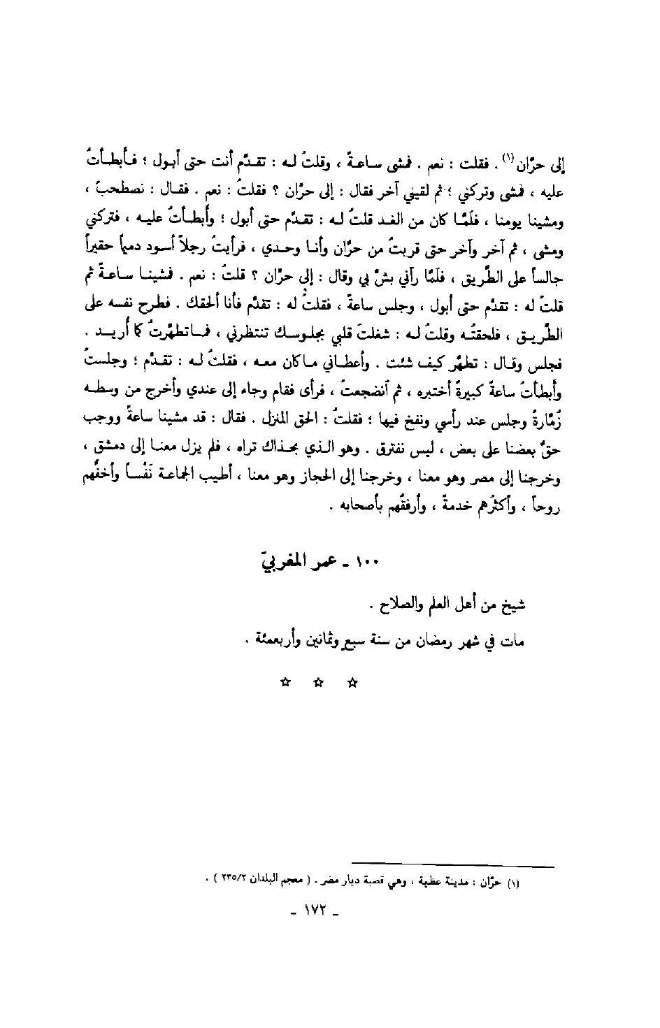 إلى حرّان. فقلت: نعم. فمشى ساعة، وقلت له: تقدّم أنت حتى أبول؛ فأبطأت عليه، فمشى وتركني؛ ثم لقيني آخر فقال: إلى حرّان؟ فقلت: نعم. فقال: نصطحب، ومشينا يومنا، فلمّا كان من الغد قلت له: تقدّم حتى أبول؛ فأبطأت عليه، فتركني ومشى، ثم آخر وآخر حتى قربت من حرّان وأنا وحدي، فرأيت رجلاً أسود دميماً حقيراً جالساً على الطّريق، فلمّا رآني بشّ بي وقال: إلى حرّان؟ قلت: نعم. فمشينا ساعةً ثم قلت له: تقدّم فأنا ألحقك. فطرح نفسه على الطّريق، فلحقته وقلت له: شغلت قلبي بجلوسك تنتظرني، فما تطهّرت كما أريد. فجلس وقال: تطهّر كيف شئت. وأعطاني ما كان معه، فقلت له: تقدّم؛ وجلست وأبطأت ساعةً كبيرةً أختبره، ثم انضجعت، فرأى فقام وجاء إلى عندي وأخرج من وسطه زمّارة وجلس عند رأسي ونفخ فيها؛ فقلت: الحق المنزل. فقال: قد مشينا ساعةً ووجب حقّ بعضنا على بعض، ليس نفترق. وهو الذي بحذاك تراه، فلم يزل معنا إلى دمشق، وخرجنا إلى مصر وهو معنا، وخرجنا إلى الحجاز وهو معنا، أطيب الجماعة نفساً وأخفّهم روحاً، وأكثرهم خدمةً، وأرفقهم بأصحابه.