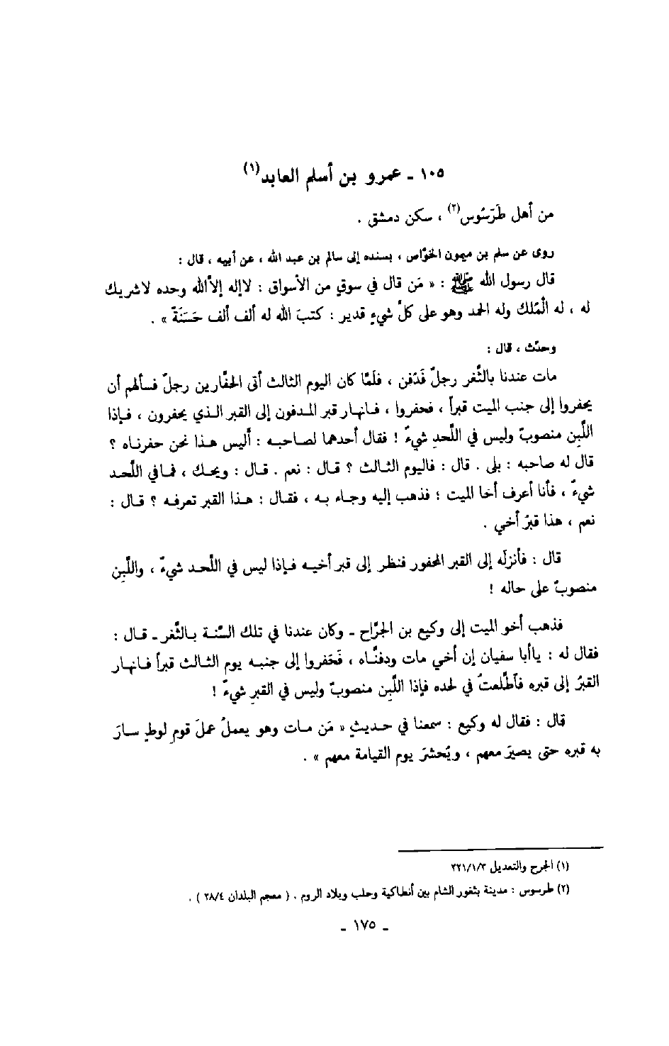 وحدّث، قال: مات عندنا بالثّغر رجل فدفن، فلّما كان اليوم الثالث أتى الحفّارين رجل فسألهم أن يحفروا إلى جنب الميت قبراً، فحفروا، فانهار قبر المدفون إلى القبر الذي يحفرون، فإذا اللّبن منصوب وليس في اللّحد شيء! فقال أحدهما لصاحبه: أليس هذا نحن حفرنا؟ قال له صاحبه: بلى. قال: فاليوم الثالث؟ قال: نعم. قال: ويحك، فما في اللّحد شيء، فأنا أعرف أخا الميت؛ فذهب إليه وجاء به، فقال: هذا القبر تعرفه؟ قال: نعم، هذا قبر أخي. قال: فأنزله إلى القبر المحفور فنظر إلى قبر أخيه فإذا ليس في اللّحد شيء، واللّبن منصوب على حاله! فذهب أخو الميت إلى وكيع بن الجرّاح وكان عندنا في تلك السّنة بالثّغر قال: فقال له: يا أبا سفيان إن أخي مات ودفنّاه، فحفروا إلى جنبه يوم الثالث قبراً فانهار القبر إلى قبره فاطّلعت في لحده فإذا اللّبن منصوب وليس القبر شيء! قال: فقال له وكيع: سمعنا في حديث " من مات وهو يعمل عمل قوم لوط سار به قبره حتى يصير معهم، ويحشر يوم القيامة معهم ".
