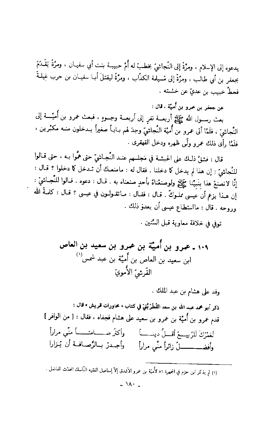 عن جعفر بن عمرو بن أميّة، قال: بعث رسول الله صَلَّى اللهُ عَلَيْهِ وَسَلَّمَ أربعة نفر إلى أربعة وجوه، فبعث عمرو بن أميّة إلى النّجاشيّ، فلمّا أتى عمرو بن أميّة النّجاشيّ وجد لهم باباً صغيراً يدخلون منه مكبّرين، فلمّا رأى ذلك عمرو ولّى ظهره ودخل القهقرى. قال: فشقّ ذلك على الحبشة في مجلسهم عند النّجاشيّ حتى همّوا به، حتى قالوا للنّجاشيّ: إن هذا لم يدخل كما دخلنا. فقال له: ما منعك أن تدخل كما دخلوا؟ قال: إنّا لا نصنع هذا بنبيّنا صَلَّى اللهُ عَلَيْهِ وَسَلَّمَ ولو صنعناه بأحد صنعناه به. قال: دعوه. قالوا للنّجاشيّ: إن هذا يزعم أن عيسى مملوك. قال: فقال: ما تقولون في عيسى؟ قال: كلمة الله وروحه. قال: ما استطاع عيسى أن يعدو ذلك. توفي في خلافة معاوية قبل السّتين.
