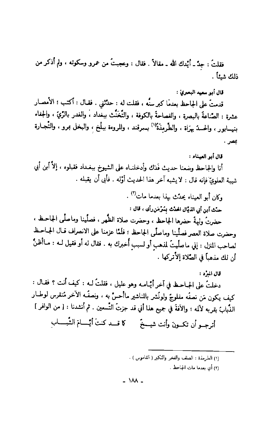 قال المبرّد: دخلت على الجاحظ في آخر أيّامه وهو عليل، فقلت له: كيف أنت؟ فقال: كيف يكون من نصفّ مفلوج ولو نشر بالمناشير ما أحسّ به، ونصفه الآخر منقرس لو طار الذّباب بقربه لآلمه؛ والآفة في جميع هذا أني قد جزت التّسعين. ثم أنشدنا: من الوافر