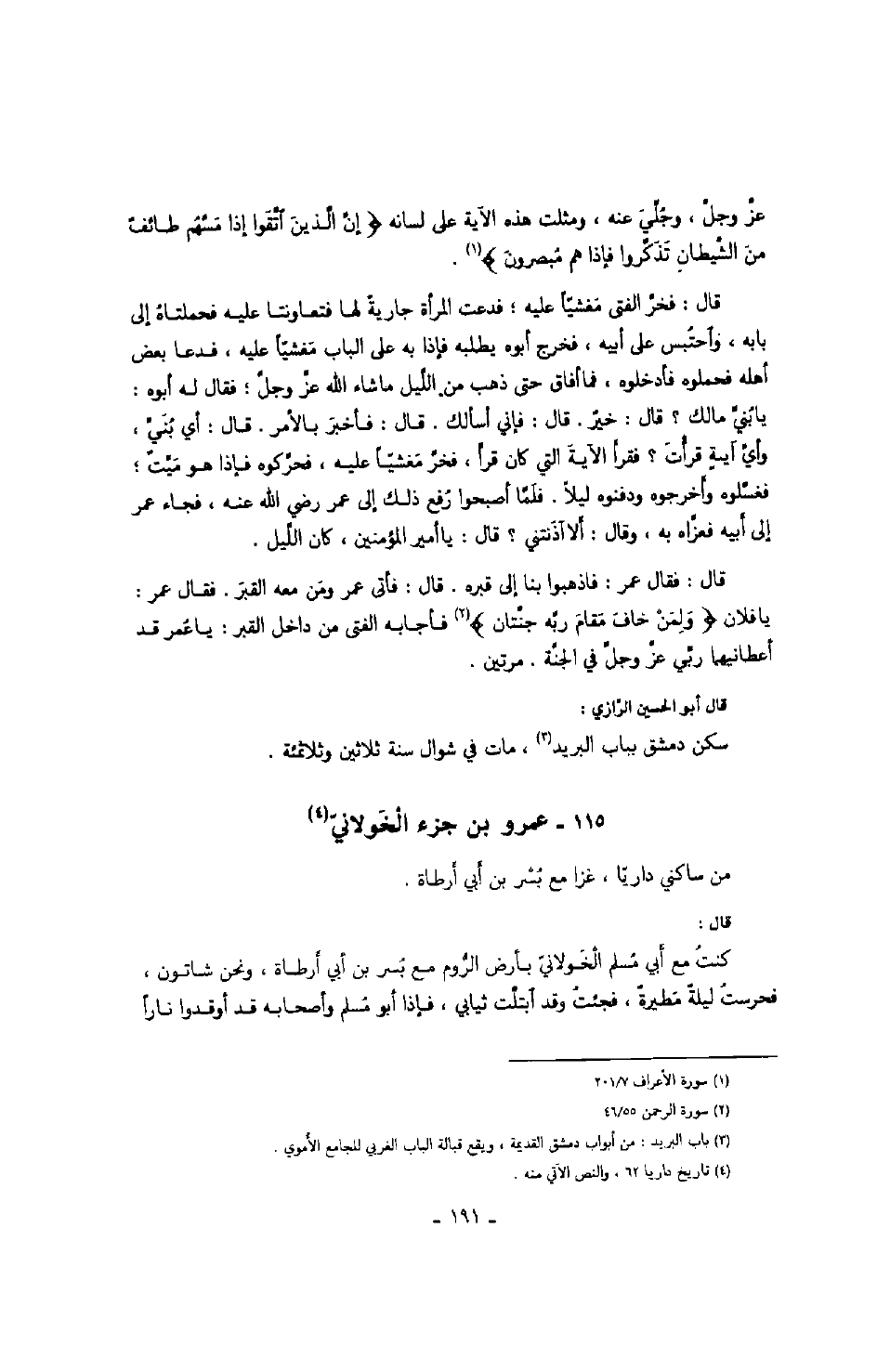 حدّث عن عمران بن موسى الطّرسوسيّ، عن أبي صالح كاتب اللّيث، عن يحيى بن أيّوب الخزاعيّ، قال: سمعت من يذكر أنه كان في زمن عمر بن الخطّاب شابّ متعبّد قد لزم المسجد، وكان عمر به معجباً، وكان له أب شيخ كبير، فكان إذا صلّى العتمة انصرف إلى أبيه، وكان طريقه على باب امرأة فافتنت به، فكانت تنصب نفسها له على طريقه؛ فمرّ بها ذات ليلة، فما زالت تغويه حتى تبعها، فلمّا أتى الباب دخلت، وذهب يدخل فذكر الله عزّ جلّ، وجلّي عنه، ومثلت هذه الآية على لسانه " إنّ الّذين اتقوا الله إذا مسّهم طائف من الشّيطان تذكّروا فإذا هم مبصرون ". قال: فخرّ الفتى مغشيّاً عليه؛ فدعت المرأة جاريةً لها فتعاونتا عليه فحملتاه إلى بابه، واحتبس على أبيه، فخرج أبوه يطلبه فإذا به على الباب مغشيّاً عليه، فدعا بعض أهله فحملوه فأدخلوه، فما أفاق حتى ذهب من اللّيل ما شاء الله عزّ وجلّ؛ فقال له أبوه: يا بنيّ مالك؟ قال: خير. قال: فإني أسألك. قال: فأخبر بالأمر. قال: أي بنيّ، وأيّ آية قرأت؟ فقرأ الآية التي كان قرأ، فخرّ مغشيّاً عليه، فحرّكوه فإذا هو ميّت؛ فغسّلوه وأخرجوه ودفنوه ليلاً. فلمّا أصبحوا رفع ذلك إلى عمر رضي الله عنه، فجاء عمر إلى أبيه فعزّاه به، وقال: ألا آذنتني؟ قال: يا أمير المؤمنين، كان اللّيل. قال: فقال عمر: فاذهبوا بنا إلى قبره. قال: فأتى عمر ومن معه القبر. فقال عمر: يا فلان " ولمن خاف مقام ربّه جنّتان " فأجابه الفتى من داخل القبر: يا عمر قد أعطانيهما ربّي عزّ وجلّ في الجنّة. مرتين.