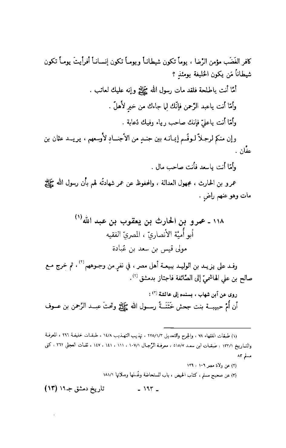 كافرالغضب مؤمن الرّضا، يوماً تكون شيطاناً ويوماً تكون إنساناً أفرأيت يوماً تكون شيطاناً من يكون الخليفة يومئذ؟ أمّا أنت يا طلحة فلقد مات رسول الله صَلَّى اللهُ عَلَيْهِ وَسَلَّمَ وإنه عليك لعاتب. وأمّا أنت يا عبد الرّحمن فإنّك لما جاءك من خير لأهل. وأمّا أنت يا عليّ فإنك صاحب رياء وفيك دعابة. وإن منكم لرجلاً لو قسم إيمانه بين جند من الأجناد لأوسعهم، يريد عثمان بن عفّان. وأمّا أنت يا سعد فأنت صاحب مال. عمرو بن الحارث، مجهول العدالة، والمحفوظ عن عمر شهادته لهم بأن رسول الله صَلَّى اللهُ عَلَيْهِ وَسَلَّمَ مات وهو عنهم راض.