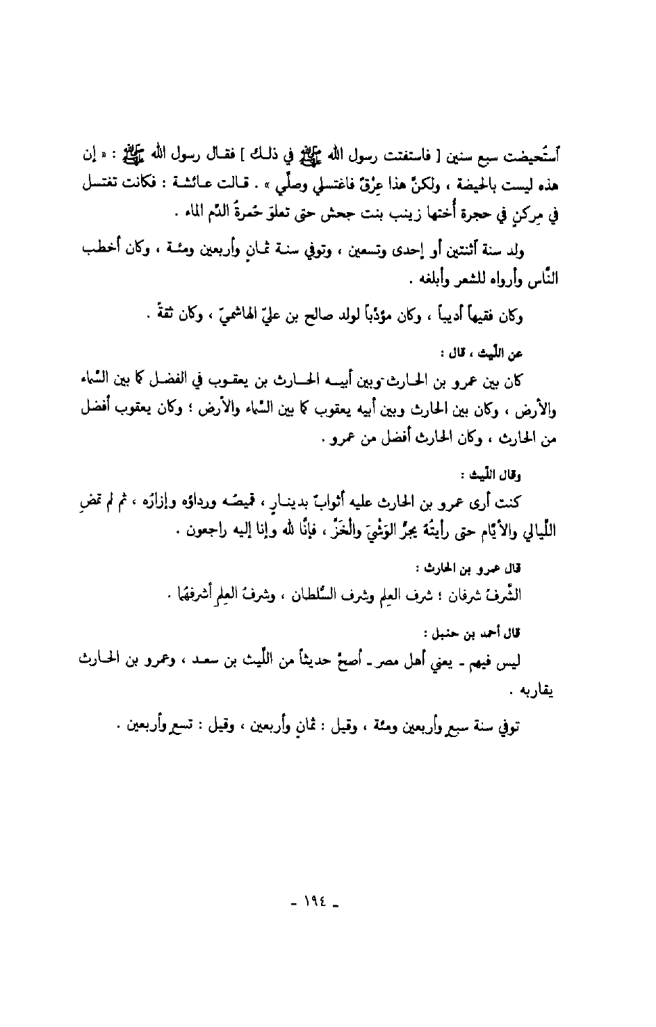 قال أحمد بن حنبل: ليس فيهم يعني أهل مصر أصحّ حديثاً من اللّيث بن سعد، وعمرو بن الحارث يقاربه. توفي سنة سبع وأربعين ومئة، وقيل: ثمان وأربعين، وقيل: تسع وأربعين.