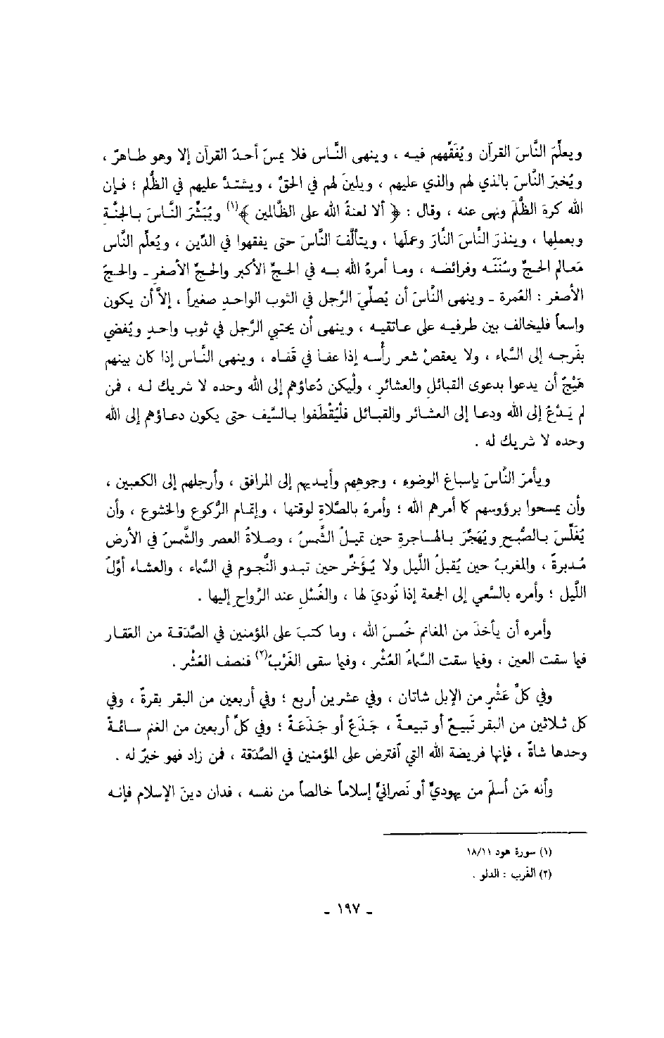 ويعلّم النّاس القرآن ويفقّههم فيه، وينهى النّاس فلا يمسّ أحد القرآن إلا وهو طاهر، ويخبر النّاس بالذي لهم والذي عليهم، ويلين لهم في الحقّ، ويشتدّ عليهم في الظّلم؛ فإن الله كره الظّلم ونهى عنه، وقال: " ألا لعنة الله على الظّالمين " ويبشّر النّاس بالجنّة وبعملها، وينذر النّاس النّار وعملها، ويتألّف النّاس حتى يفقهوا في الدّين، ويعلّم النّاس معالم الحجّ وسننه وفرائضه، وما أمره الله به في الحجّ الأكبر والحجّ الأصغر والحجّ الأصغر: العمرة وينهى النّاس أن يصلّي الرّجل في الثوب الواحد صغيراً، إلاّ أن يكون واسعاً فليخالف بين طرفيه على عاتقيه، وينهى أن يحتبي الرّجل في ثوب واحد ويفضي بفرجه إلىالسّماء، ولا يعقص شعر رأسه إذا عفا في قفاه، وينهى النّاس إذا كان بينهم هيج أن يدعوا بدعوى القبائل والعشائر، وليكن دعاؤهم إلى الله وحده لا شريك له، فمن لم يدع إلى الله ودعا إلى العشائر والقبائل فليقطفوا بالسّيف حتى يكون دعاؤهم إلى الله وحده لا شريك له. ويأمر النّاس بإسباغ الوضوء، وجوههم وأيديهم إلى المرافق، وأرجلهم إلى الكعبين، وأن يمسحوا برؤوسهم كما أمرهم الله؛ وأمره بالصّلاة لوقتها، وإتمام الرّكوع والخشوع، وأن يغلّس بالصّبح ويهجّر بالهجرة حين تميل الشّمس، وصلاة العصر والشّمس في الأرض مدبرة، والمغرب حين يقبل اللّيل ولا يؤخّر حين تبدو النّجوم في السّماء، والعشاء أوّل اللّيل؛ وأمره بالسّعي إلى الجمعة إذا نودي لها، والغسل عند الرّواح إليها. وأمره أن يأخذ من المغانم خمس الله، وما كتب على المؤمنين في الصّدقة من العقار فيما سقت العين، وفيما سقت السّماء العشر، وفيما سقى الغرب فنصف العشر. وفي كلّ عشر الإبل شاتان، وفي عشرين أربع؛ وفي أربعين من البقر بقرة، وفي كل ثلاثين من البقر تبيع أو تبيعة، جذع أو جذعة؛ وفي كلّ أربعين من الغنم سائمةً وحدها شاة، فإنها فريضة الله التي افترض على المؤمنين في الصّدقة، فمن زاد فهو خير له. وأنه من أسلم من يهوديّ أو نصرانيّ إسلاماً خالصاً من نفسه، فدان دين الإسلام فإنه