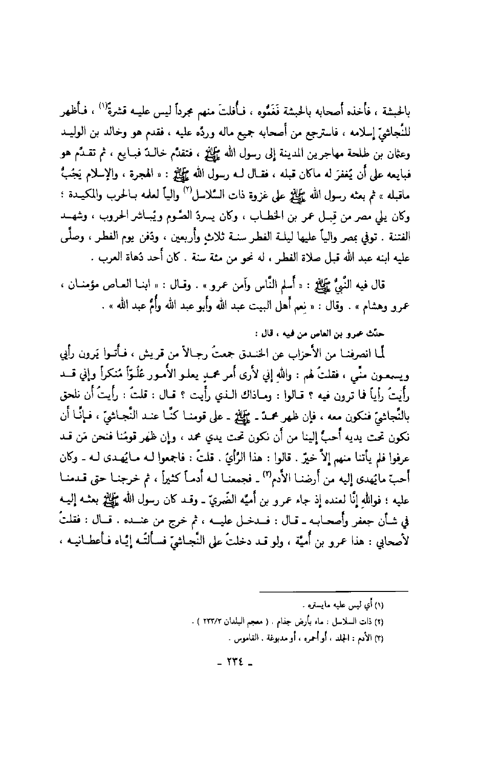 حدّث عمرو بن العاص من فيه، قال: لمّا انصرفنا من الأحزاب عن الخندق جمعت رجالاً من قريش، فأتوا يرون رأيي ويسمعون منّي، فقلت لهم: والله إني لأرى أمر محمد يعلو الأمور علوّاً منكراً وإني قد رأيت رأياً فما ترون فيه؟ قالوا: وما ذاك الذي رأيت؟ قال: قلت: رأيت أن نلحق بالنّجاشيّ فنكون معه، فإن ظهر محمد صَلَّى اللهُ عَلَيْهِ وَسَلَّمَ على قومنا كنّا عند النّجاشيّ، فإنّا أن نكون تحت يديه أحبّ إلينا من أن نكون تحت يدي محمد، وإن ظهر قومنا فنحن من قد عرفوا فلم يأتنا منهم إلاّ خير. قالوا: هذا الرّأي. قلت: فاجمعوا له ما يهدى له وكان أحبّ ما يهدى إليه من أرضنا الأدم فجمعنا له أدماً كثيراً، ثم خرجنا حتى قدمنا عليه؛ فوالله إنّا لعنده إذ جاء عمرو بن أميّه الضّمريّ وقد كان رسول الله صَلَّى اللهُ عَلَيْهِ وَسَلَّمَ بعثه إليه في شأن جعفر وأصحابه قال: فدخل عليه، ثم خرج من عنده. قال: فقلت لأصحابي: هذا عمرو بن أميّة، ولو قد دخلت على النّجاشيّ فسألته إيّاه فأعطانيه،