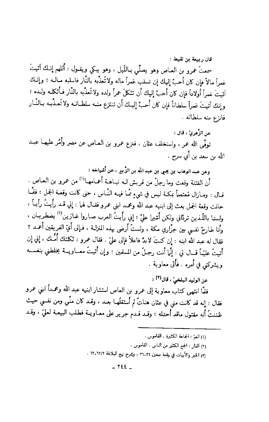 وعن عبد الوهاب بن يحيى بن عبد الله الزّبير، عن أشياخه: أن الفتنة وقعت وما رجل من قريش له نباهة أعمامها من عمرو بن العاص. قال: ومازال معتصماً بمكة ليس في شيء ممّا فيه النّاس، حتى كانت وقعة الجمل؛ فلّما حانت وقعة الجمل بعث إلى ابنيه عبد الله ومحمد ابني عمرو فقال لهما: إني قد رأيت رأياً، ولستما باللّذين تردّاني ولكن أشيراً عليّ؛ إني رأيت العرب صاروا غارين يضطربان، وأنا طارح نفسي بين جزّاري مكة، ولست أرضي بهذه المنزلة، فإلى أيّ الفريقين أعمد؟ فقال له عبد الله ابنه: إن كنت لا بدّ فاعلاً فإلى عليّ. فقال عمرو: ثكلتك أمّك، إني إن أتيت عليّاً قال لي: إنّما أنت رجل من المسلمين؛ وإن أتيت معاوية يخلطني بنفسه ويشركني في أمره. فأتى معاوية.