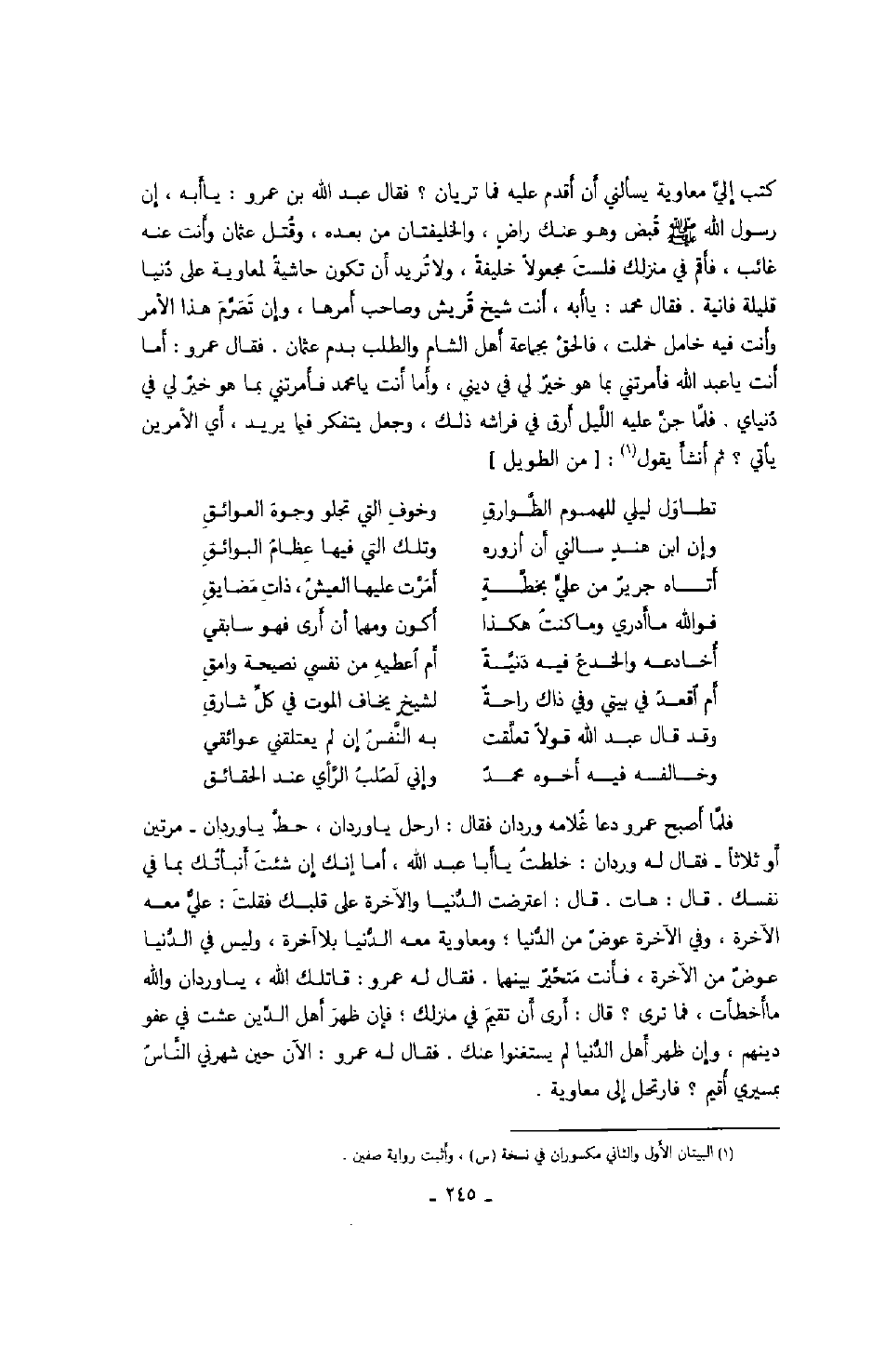 كتب إليّ معاوية يسألني أن أقدم عليه فما تريان؟ فقال عبد الله بن عمرو: يا أبه، إن رسول الله صَلَّى اللهُ عَلَيْهِ وَسَلَّمَ قبض وهو عنك راض، والخليفتان من بعده، وقتل عثمان وأنت عنه غائب، فأقم في منزلك فلست مجعولاً خليفة، ولا تريد أن تكون حاشية لمعاوية على دنيا قليلة فانية. فقال محمد: يا أبه، أنت شيخ قريش وصاحب أمرها، وإن تصرّم هذا الأمر وأنت فيه خامل خملت، فالحق بجماعة أهل الشام والطلب بدم عثمان. فقال عمرو: أما أنت يا عبد الله فأمرتني بما هو خير لي في ديني، وأما أنت يا محمد فأمرتني بما هو خير لي في دنياي. فلّما جنّ عليه اللّيل أرق في فراشه ذلك، وجعل يتفكر فيما يريد، أي الأمرين يأتي؟ ثم أنشأ يقول: من الطويل