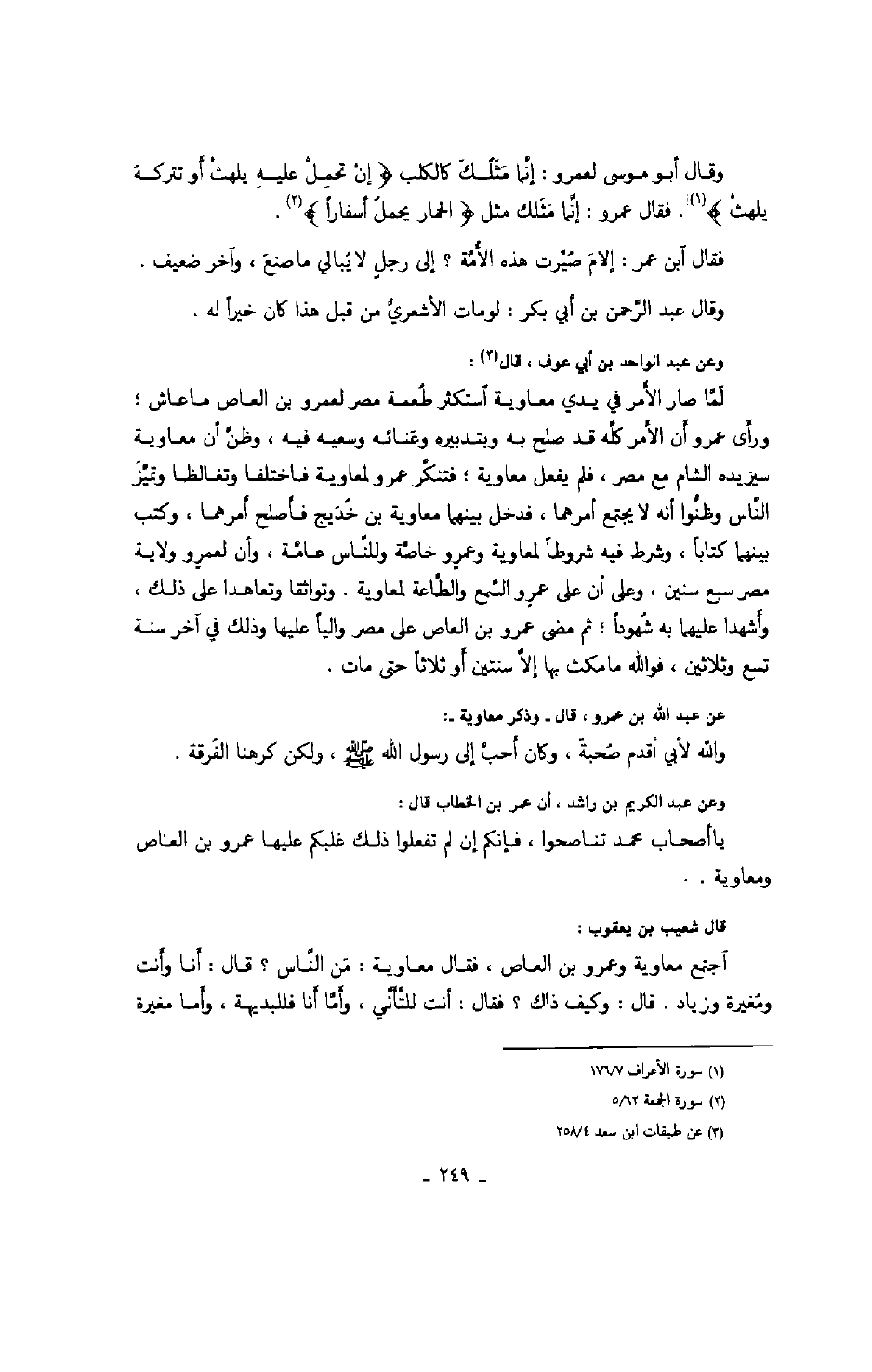 وقال أبو موسى لعمرو: إنّما مثلك كالكلب " إن تحمل عليه يلهث أو تتركه يلهث ". فقال عمرو: إنّما مثلك مثل " الحمار يحمل أسفاراً ". فقال ابن عمر: إلام صيّرت هذه الأمّة؟ إلى رجل لا يبالي ما صنع، وآخر ضعيف. وقال عبد الرّحمن بن أبي بكر: لو مات الأشعريّ من قبل هذا كان خيراً له.