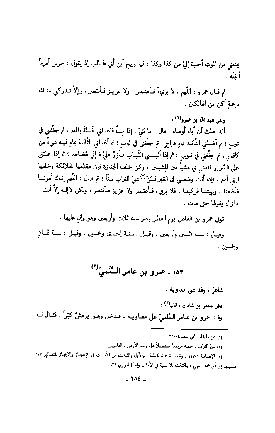 وعن عبد الله بن عمرو: أنه حدّث أن أباه أوصاه، قال: يا بنيّ، إذا متّ فاغسلني غسلةً بالماء، ثم جفّفني في ثوب؛ ثم اغسلني الثّانية بماء قراح، ثم جفّفني في ثوب؛ ثم اغسلني الثّالثة بماء فيه شيء من كافور، ثم جفّفني في ثوب؛ ثم إذا ألبستني الثّياب فأزرّ عليّ فإني مخاصم؛ ثم إذا حملتني على السّرير فامش بي مشياً بين المشيتين، وكن خلف الجنازة فإن مقدّمها للملائكة وخلفها لبني آدم، فإذا أنت وضعتني في القبر فسنّ عليّ التراب سنّاً؛ ثم قال: اللهم إنك أمرتنا فأطعنا، ونهيتنا فركبنا، فلا بريء فأعتذر ولا عزيز فأنتصر، ولكن لا إله إلاّ أنت. ما زال يقولها حتى مات.