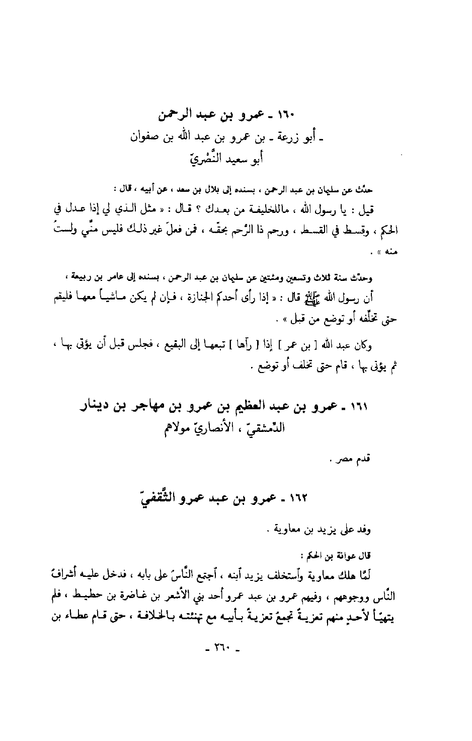 ابن عمرو بن عبد الله بن صفوان أبو سعيد النّصريّ حدّث عن سليمان بن عبد الرحمن، بسنده إلى بلال بن سعد، عن أبيه، قال: قيل: يا رسول الله، ما للخليفة من بعدك؟ قال: " مثل الذي لي إذا عدل في الحكم، وقسط في القسط، ورحم ذا الرّحم بحقه، فمن فعل غير ذلك فليس منّي ولست منه ".