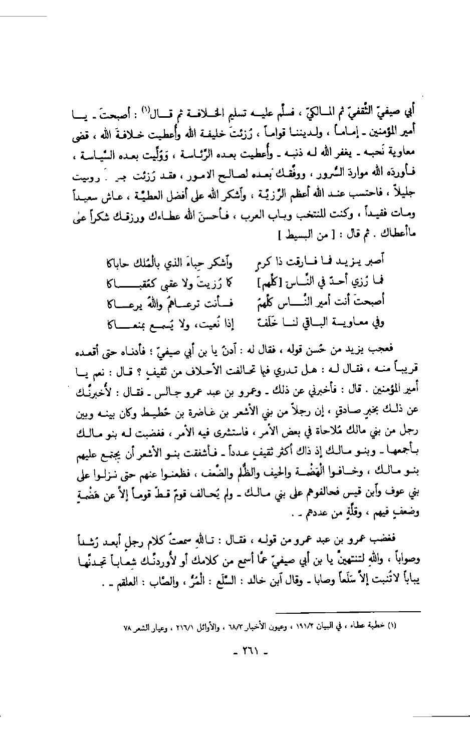 أبي صيفيّ الثّقفيّ ثم المالكيّ، فسلّم عليه تسليم الخلافة ثم قال: أصبحت يا أمير المؤمنين إماماً، ولديننا قواماً، رزئت خليفة الله وأعطيت خلافة الله، قضى معاوية نحبه يغفر الله له ذنبه وأعطيت بعده الرّئاسة، وولّيت بعده السّياسة، فأورده الله موارد السّرور، ووفّقك بعده لصالح الأمور، فقد رزئت جليلاً ووليت جليلاً، فاحتسب عند الله أعظم الرّزيّة، واشكر الله على أفضل العطيّة، عاش سعيداً ومات فقيداً، وكنت المنتخب وباب العرب، فأحسن الله عطاءك ورزقك شكراً على ما أعطاك. ثم قال: من البسيط
