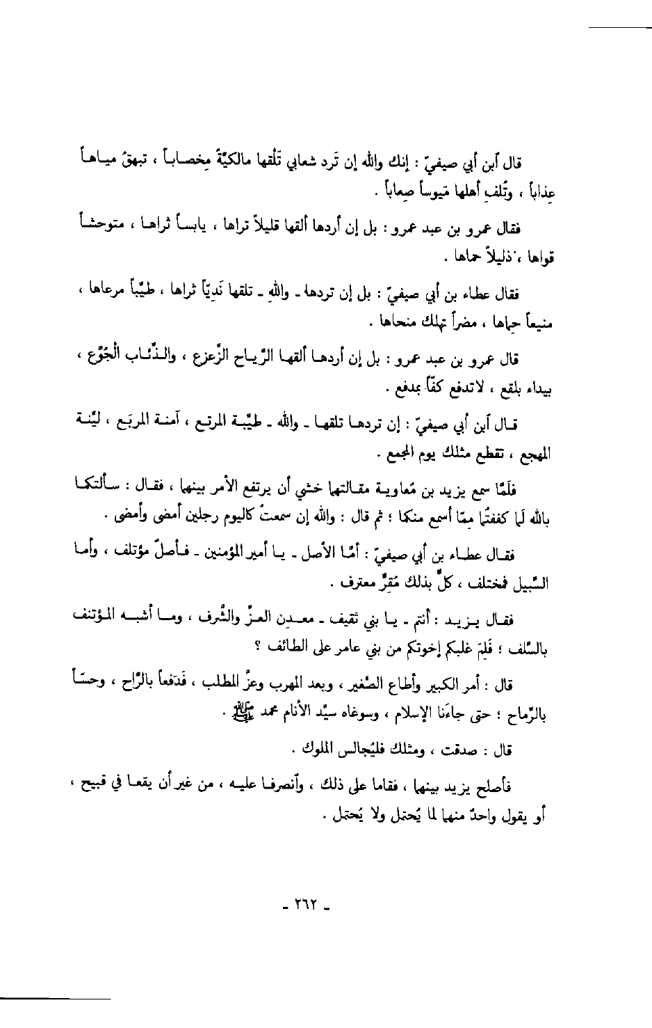 فقال عمرو بن عبد عمرو: بل إن أردها ألقها قليلاً تراها، يابساً ثراها، متوحشاً قواها، ذليلاً حماها. فقال عطاء بن أبي صيفيّ: بل إن تردها والله تلقها نديّاً ثراها، طيّباً مرعاها، منيعاً حماها، مضراً تهلك منحاها. قال عمرو بن عبد عمرو: بل إن أردها ألقها الرّياح الزّعزع، والذّئاب الجوّع، بيداء بلقع، لا تدفع كفّاً بمدفع. قال ابن أبي صيفيّ: إن تردها تلقها والله طيّبة المرتع، آمنة المربع، ليّنة المهجع، تقطع مثلك يوم المجمع. فلّما سمع يزيد بن معاوية مقالتهما خشي أن يرتفع الأمر بينهما، فقال: سألتكما بالله لما كففتما ممّا أسمع منكما؛ ثم قال: والله إن سمعت كاليوم رجلين أمضى وأمضى. فقال عطاء بن أبي صيفيّ: أمّا الأصل يا أمير المؤمنين فأصلّ مؤتلف، وأمّا السّبيل فمختلف، كلّ بذلك مقرّ معترف. فقال يزيد: أنتم يا بني ثقيف معدن العزّ والشّرف، وما أشبه المؤتنف بالسّلف؛ فلم غلبكم إخوتكم من بني عامر على الطائف؟ قال: أمر الكبير وأطاع الصّغير، وبعد المهرب وعزّ المطلب، فدفعاً بالرّاح، وحساً بالرّماح؛ حتى جاءنا الإسلام، وسوغنا سيّد الأنام محمد صَلَّى اللهُ عَلَيْهِ وَسَلَّمَ. قال: صدقت، ومثلك فليجالس الملوك. فأصلح يزيد بينهما، فقاما على ذلك، وانصرفا عليه، من غير أن يقعا في قبيح، أو يقول واحد منهما لما يحتمل ولا يحتمل.
