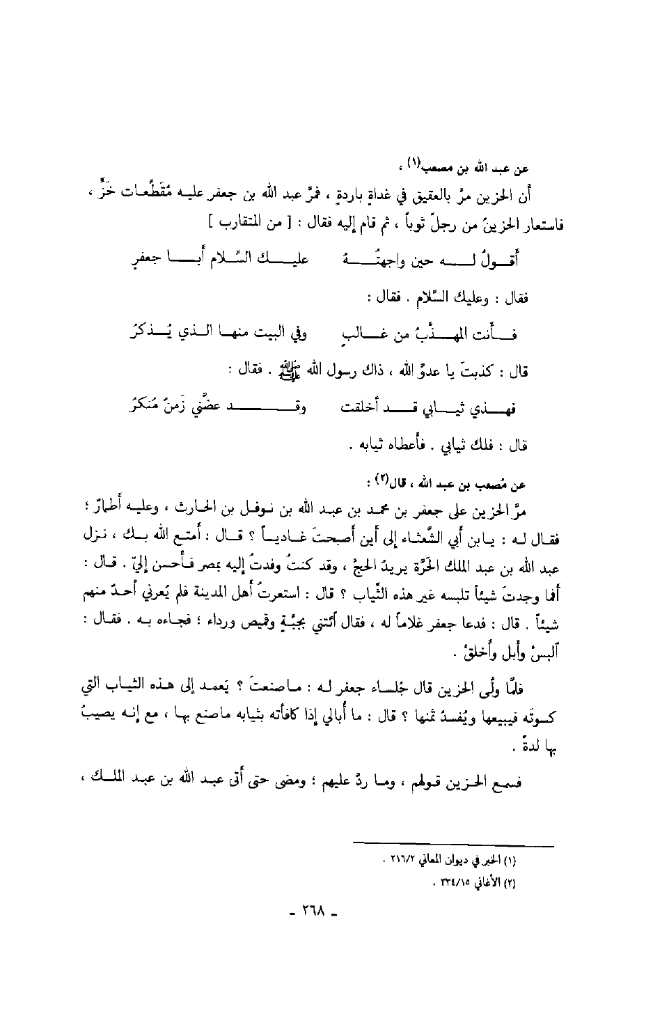 عن عبد الله بن مصعب: أن الحزين مرّ بالعقيق في غداة باردة، فمرّ عبد الله بن جعفر عليه مقطّعات خزّ، فاستعار الحزين من رجل ثوباً، ثم قام إليه فقال: من المتقارب